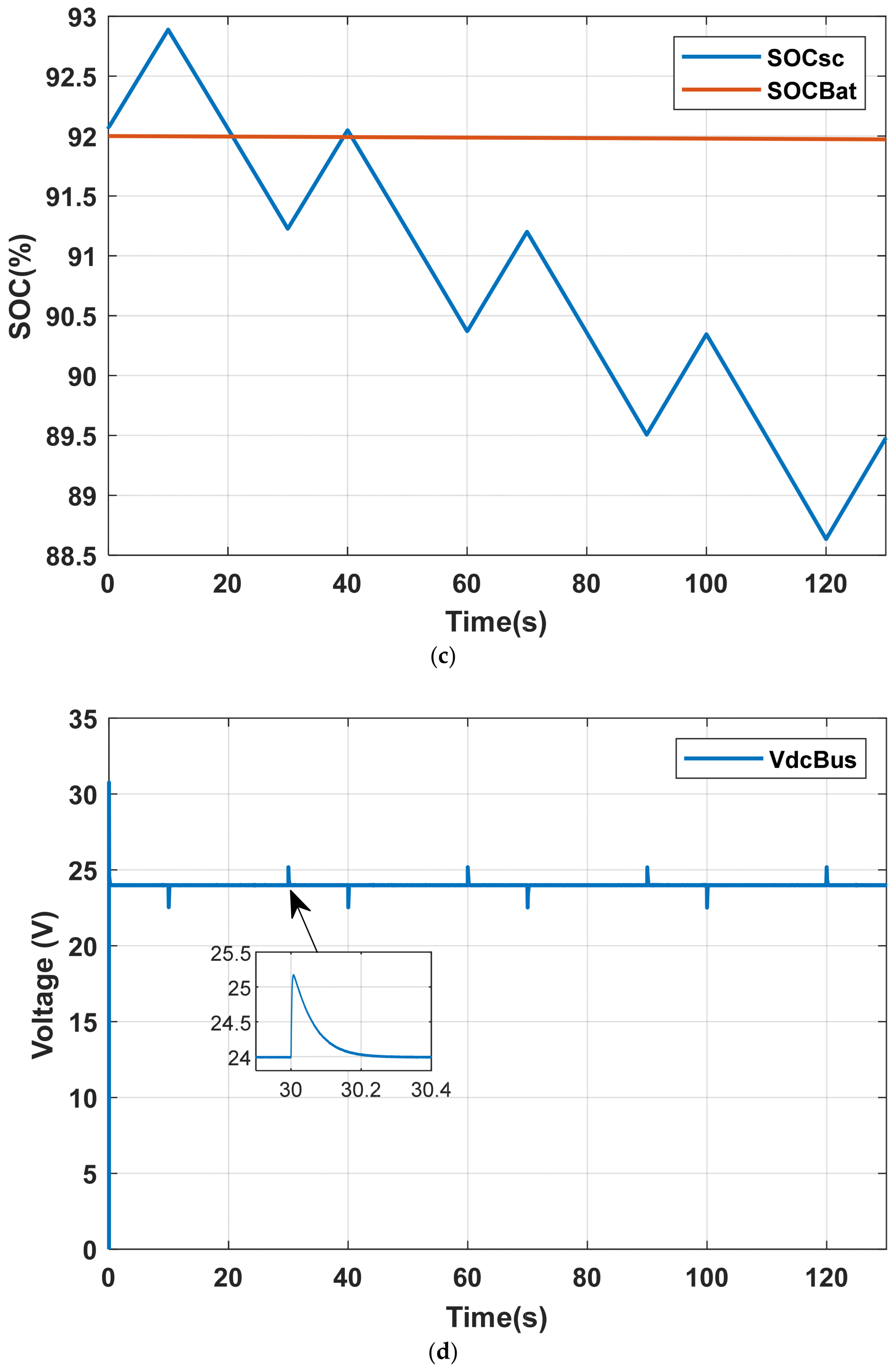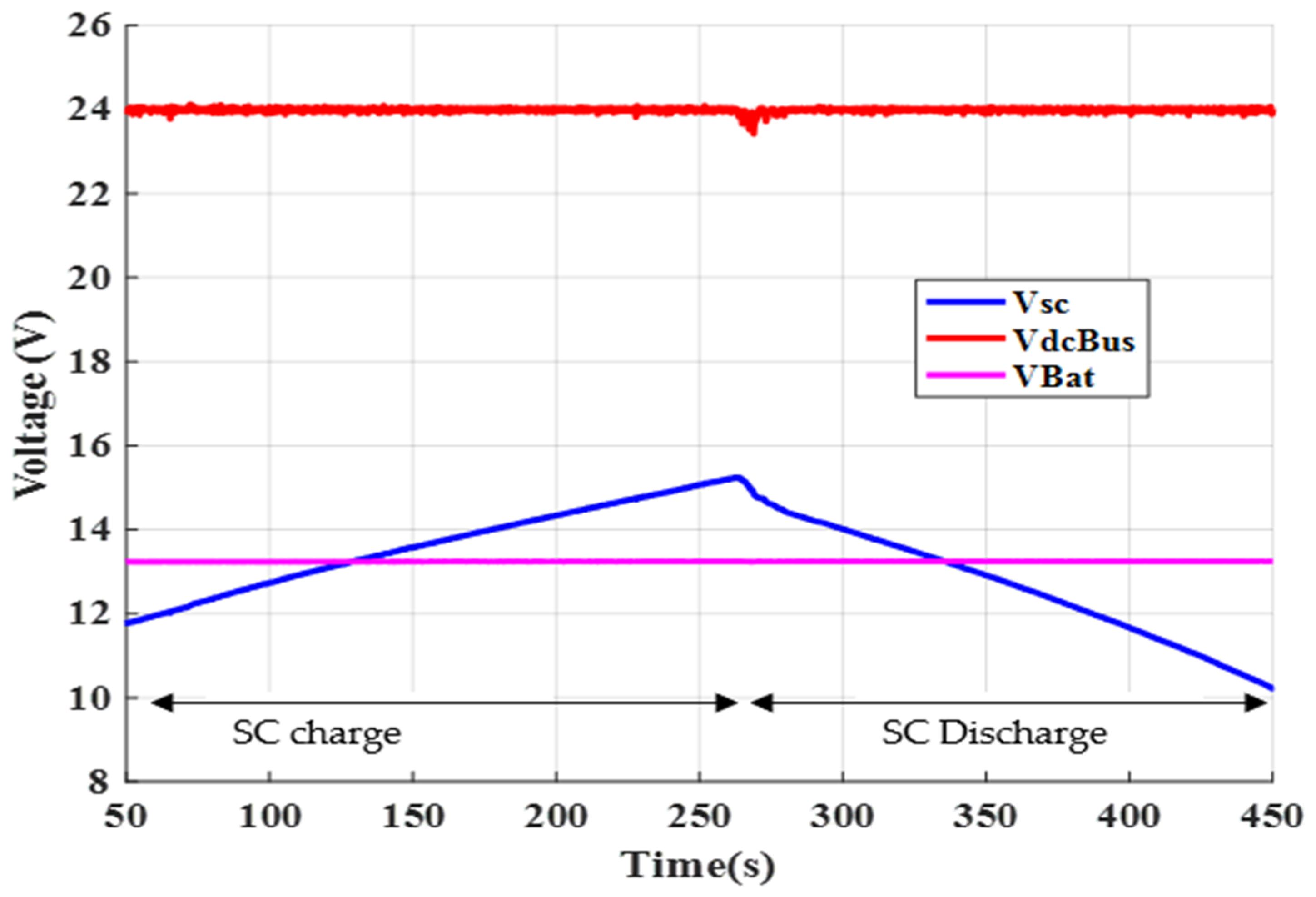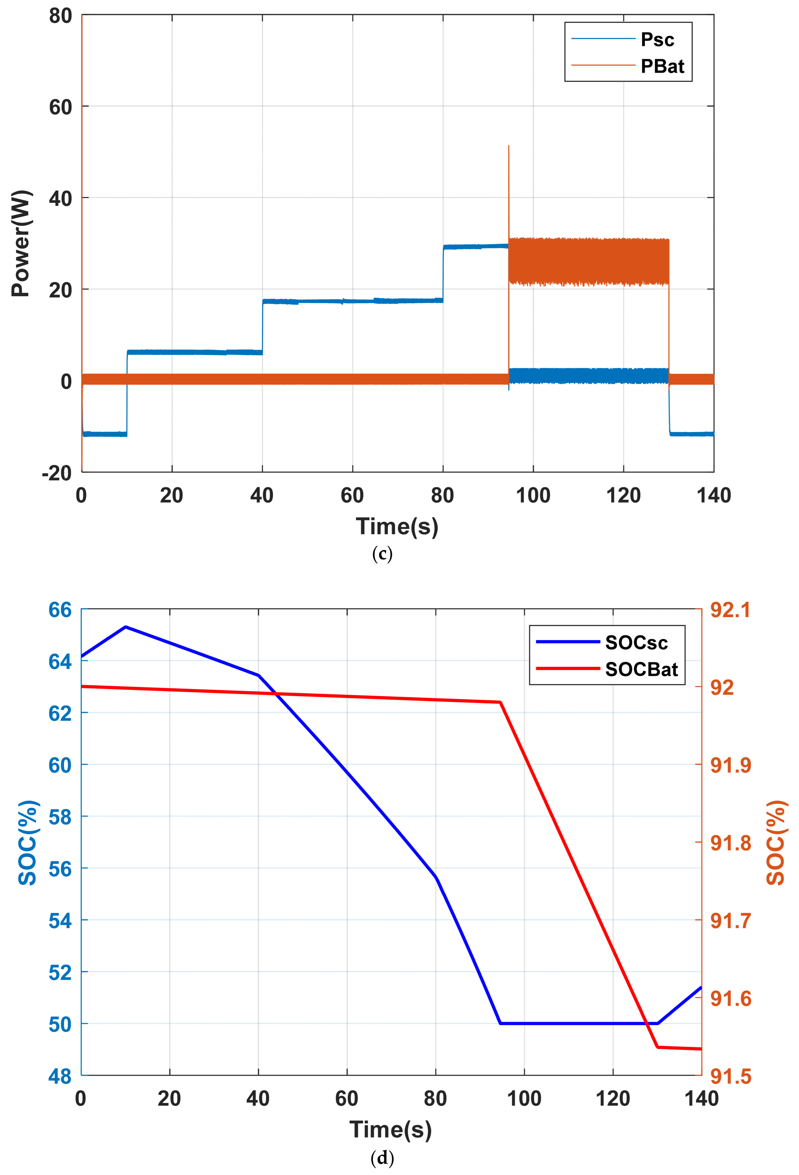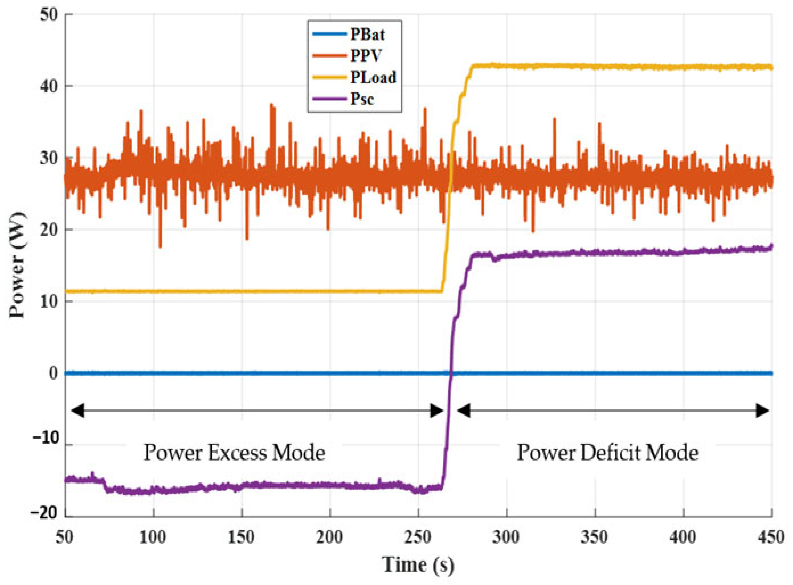 4.2. Case 2: The Battery and the Supercapacitor Are Under Nominal Load, but Only the Supercapacitor Is About to Reach Its Half-Charge State