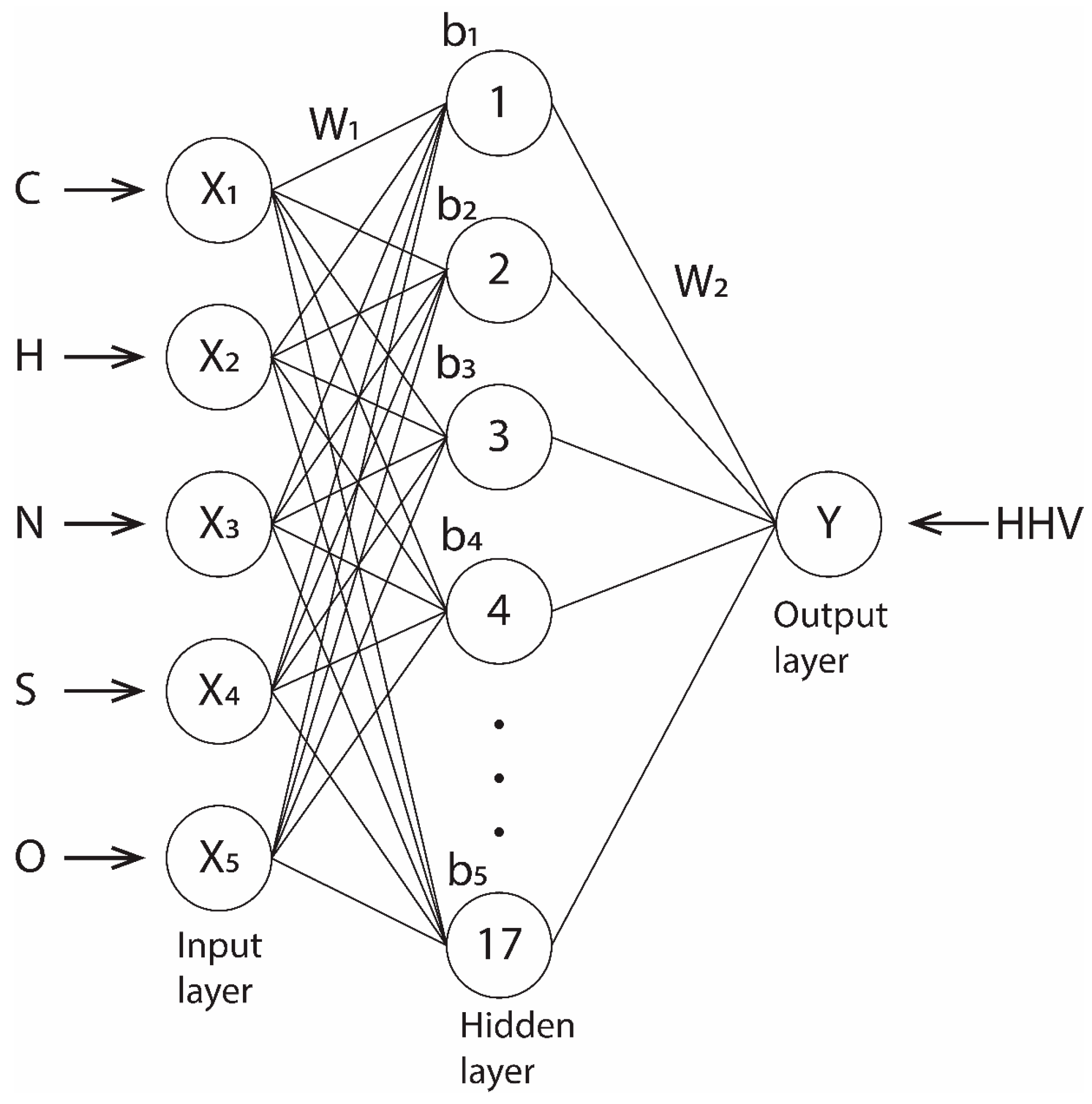 HHV is determined in the laboratory using an adiabatic calorimeter [8]. However, it is important to note that this method requires personnel training, requires time, and is often expensive. For this reason, various equations have been used to approximate HHV as accurately as possible [9]. To create such equations, data from ultimate analysis [10] are often used as input variables, consisting of five variables: carbon (C), hydrogen (H), nitrogen (N), oxygen (O), and sulfur (S) [11]. Due to the complexity of larger datasets and their interpretation, machine learning models have been increasingly applied in recent years for modeling, approximation, and predictive analysis [12]. One of the most widely used machine learning models is the artificial neural network (ANN), which operates on the principle of the human brain, making it suitable for analyzing complex tasks [13]. ANN models are suitable for modeling nonlinear tasks, identifying patterns between input and output variables, and are based on a layered structure through which data passes [14]. On the other hand, although suitable for modeling, ANN models require parameter tuning and optimization, which is not a simple task [15]. One of the most popular types of ANN models is the multilayer perceptron (MLP), a network in which information flows unidirectionally through the input, hidden, and output layers, which are interconnected [16]. A significant number of scientific papers focus on the development of ANN models for estimating the HHV of different materials based on ultimate analysis [17,18,19,20,21]. However, most research to date has focused on specific types of raw materials, such as biomass and coal, which can significantly limit the universality of the developed model, as this approach reduces the variability of input and output data. Previous research on predicting the higher calorific value (HHV) of biomass has revealed considerable differences in both the approaches and the quality of the data used. Abdollahi et al. [22] report that earlier studies randomly used datasets from ultimate and proximate analyses, as well as their combinations, resulting in heterogeneous and difficult-to-compare models. In contrast, Köcer [23] notes that newer machine learning algorithms have improved prediction accuracy, but most developed models are still based on limited datasets and specific types of biomass, which reduces their generalizability. In this research, a new methodology is presented that integrates a highly heterogeneous dataset collected from multiple independent sources and applies standardized preprocessing and an optimized artificial neural network (ANN) architecture to achieve a universal HHV prediction model, thereby overcoming the limitations of previous studies related to narrow datasets and limited model applicability. The aim of this research is to develop and validate an artificial neural network (ANN) for the reliable prediction of the higher heating value (HHV) of biomass from various origins, using elemental composition (C, H, N, S, O) as input variables. The research involved: (1) collection and standardization of data from published sources, (2) analysis of correlations between elements and HHV, (3) development, training, and evaluation of multiple ANN model architectures, and (4) comparison of ANN performance with traditional empirical models. The ultimate goal was to define a model with an optimal balance of accuracy and generalizability, applicable to a wide range of biomasses.
