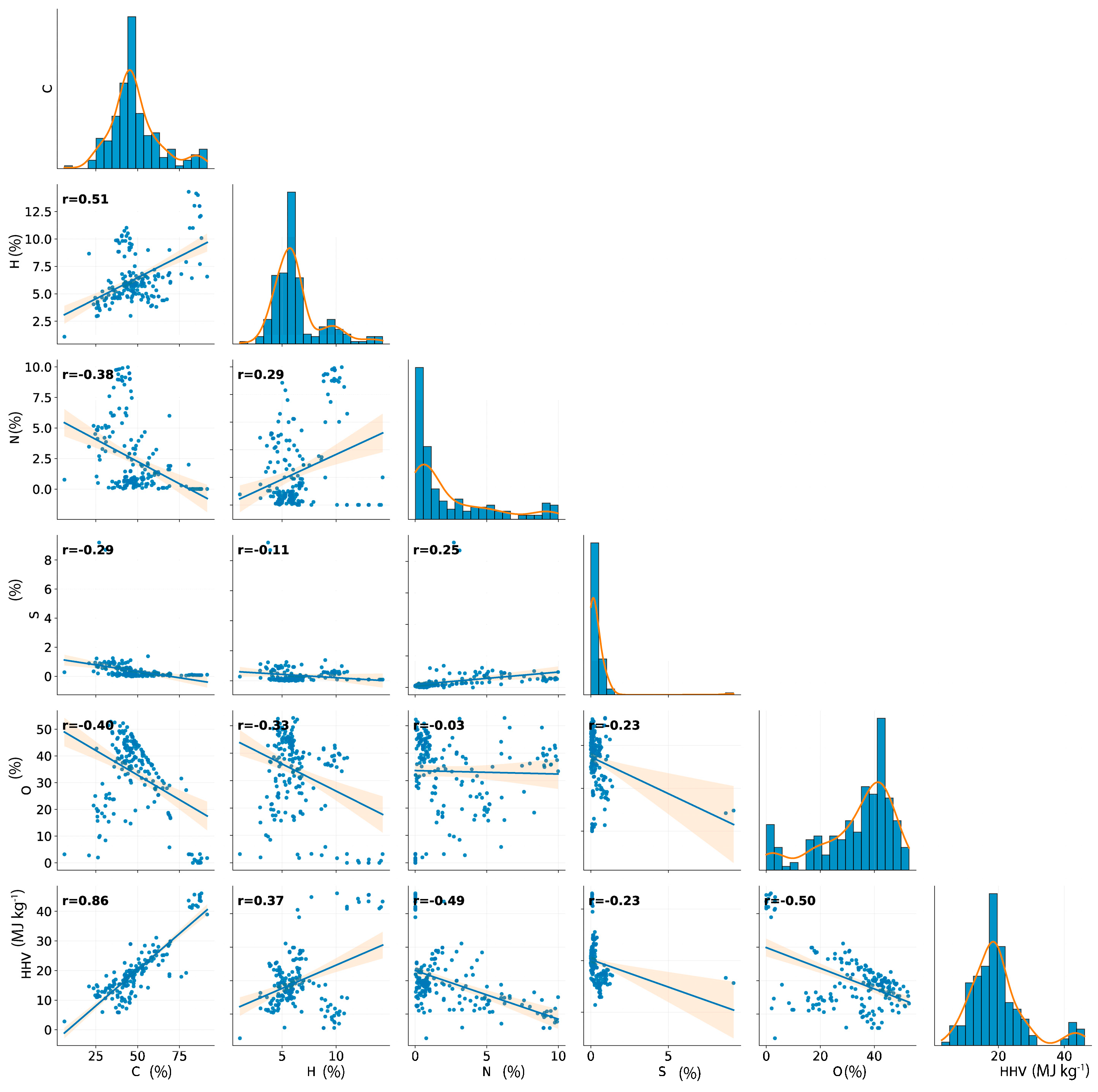 Figure 2. Scatterplot matrix with pairwise relationships and correlations between the input variables and the output (HHV).