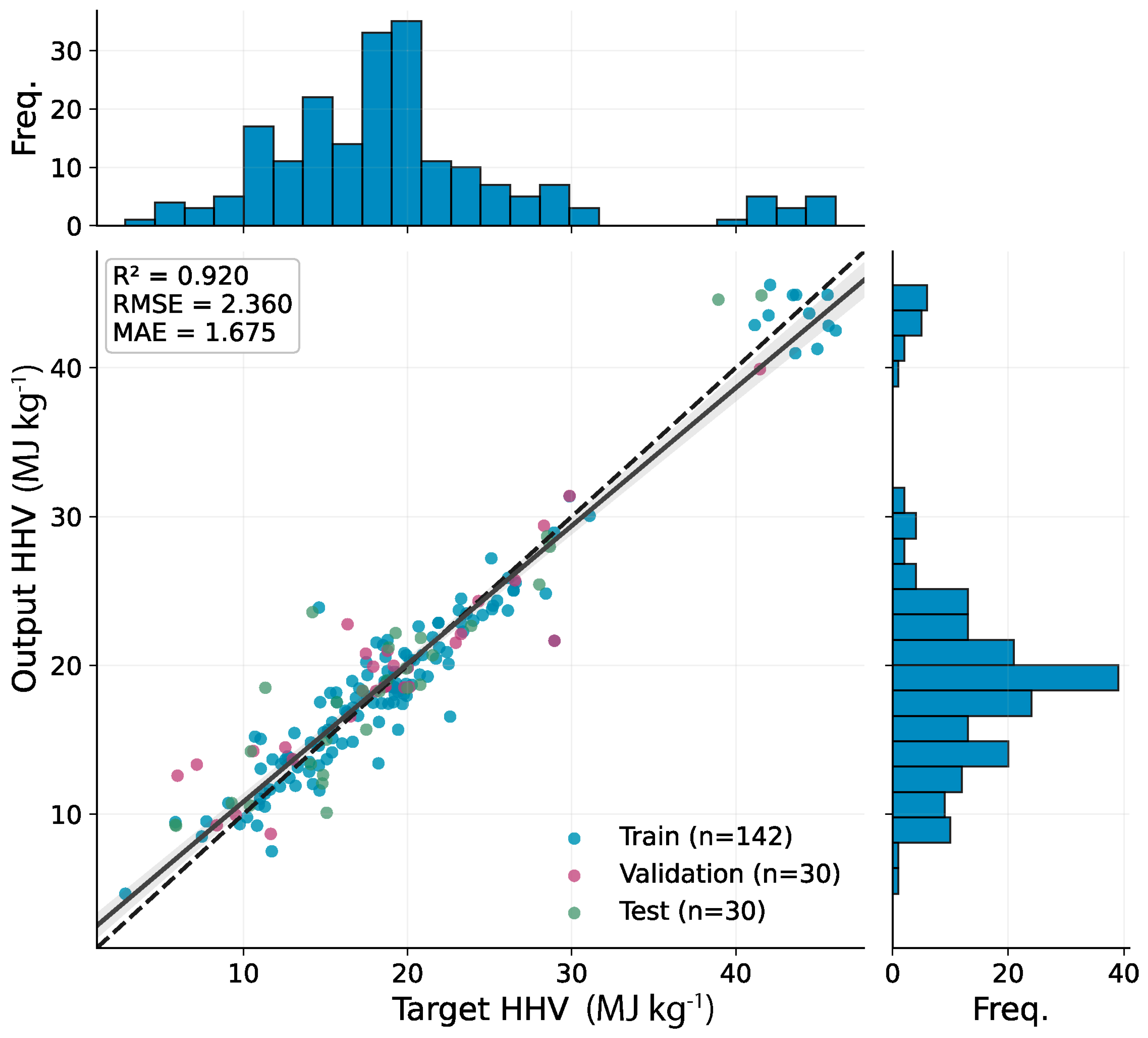 Figure 3 shows a comparison of the predicted and actual HHV values for the training, validation, and testing datasets. The histograms along the axes display the distribution of the target and predicted values.