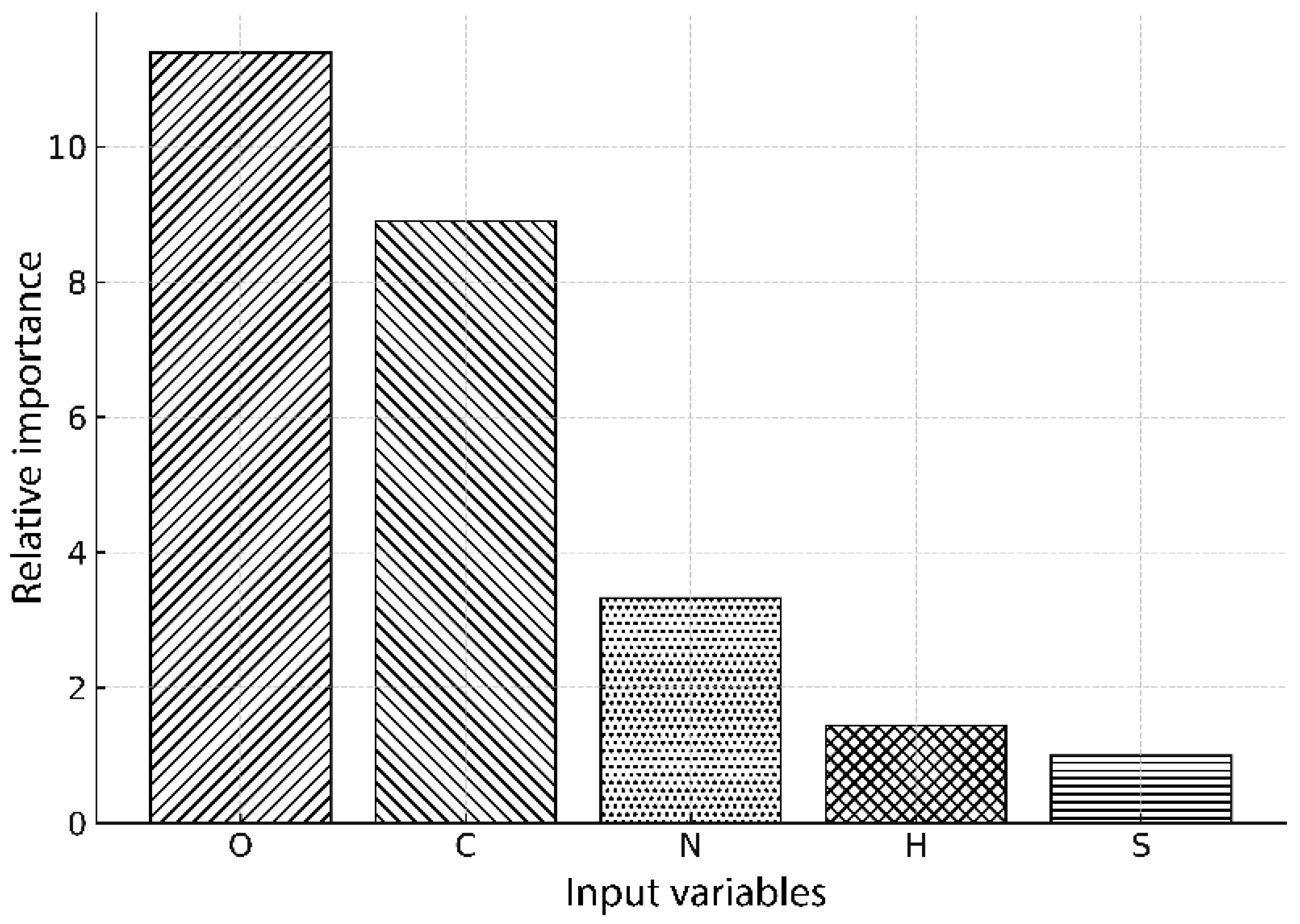 Figure 4 shows the relative importance of the input variables of the ultimate analysis in the ANN model for HHV prediction. Relative importance refers to dimensionless values obtained from the ANN model sensitivity analysis, in which each variable is assigned a numerical importance index indicating its relative contribution to the model’s predictive accuracy.