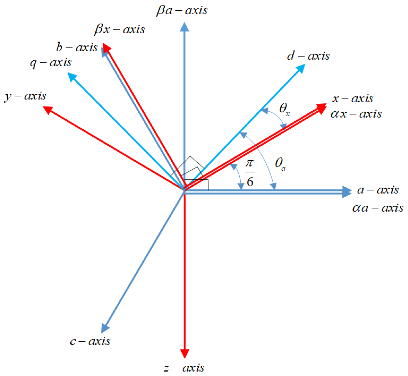 - Perform Clarke and Park transformations on the dual three-phase current feedbacks (, ) to obtain the RSRF current feedbacks (, ). The Park transformation is applied to , and to .