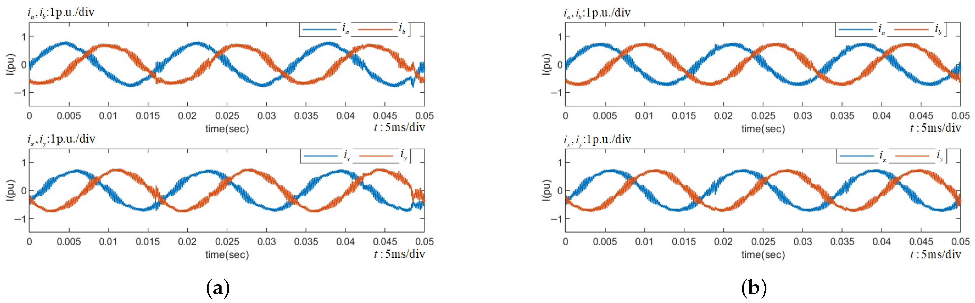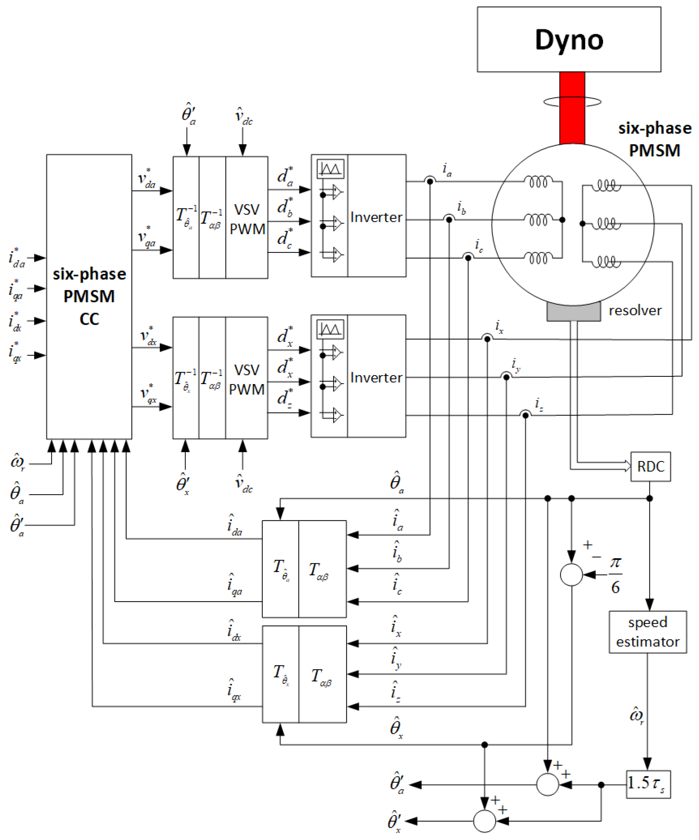 - Apply inverse Park and Clarke transformations to (, ), followed by VSVPWM to generate the dual three-phase duty ratio references (, ). The inverse Park transformation is used for , and for .