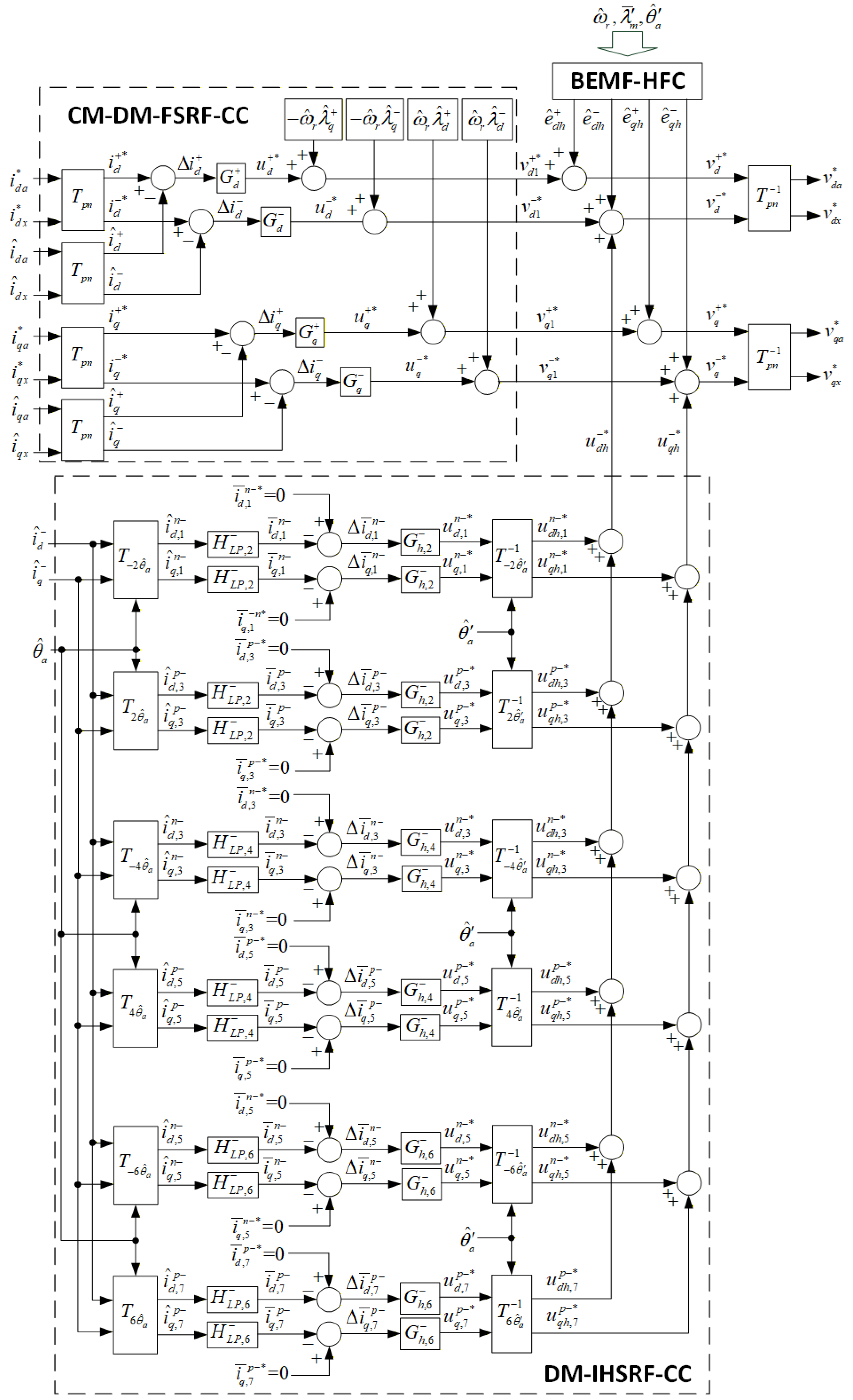 - Execute the BEMF-HFC, where the inputs are the rotor electrical angle and electrical speed feedback , and the outputs are the BEMF harmonics and .