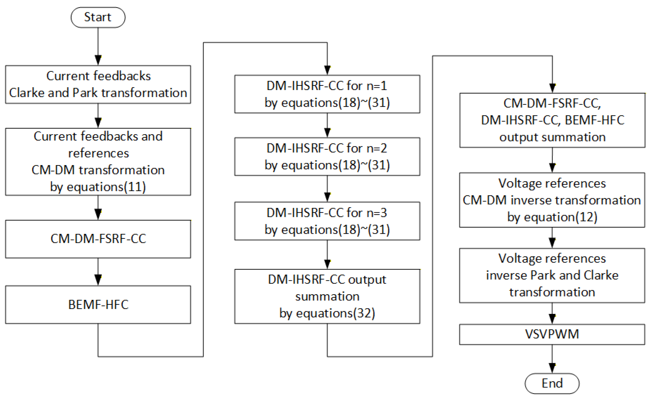 - Execute the CM-DM-FSRF-CC, using the CM-DM current references and feedbacks as inputs to generate the voltage references and .