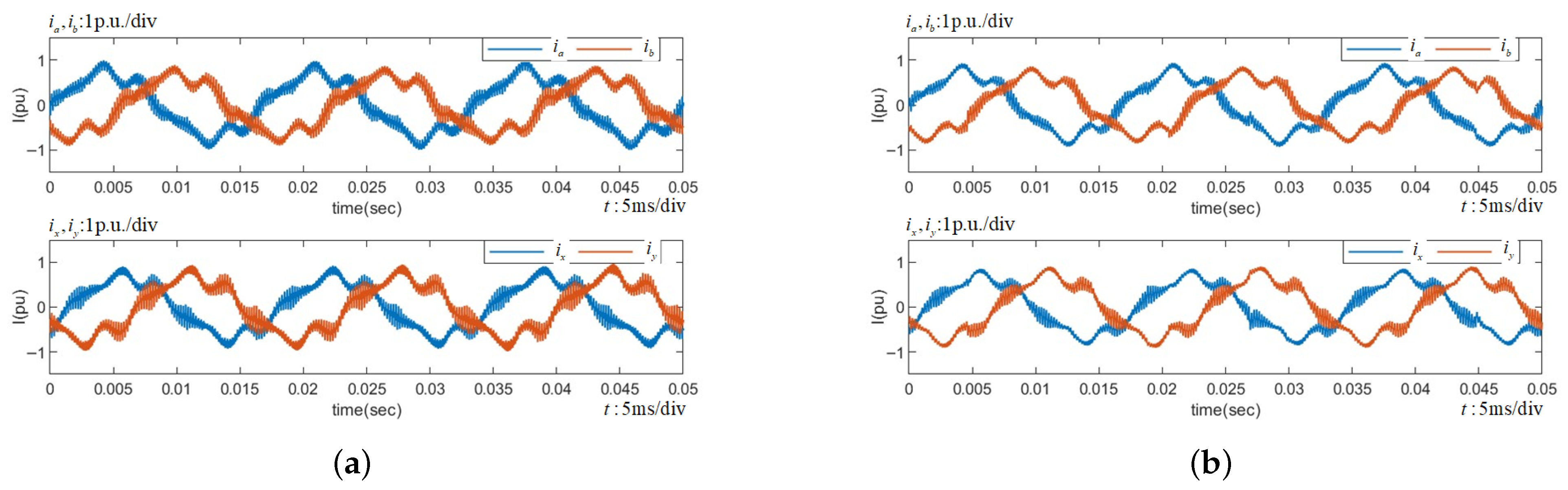 - Hu, Y.; Zhu, Z.-Q.; Liu, K. Current Control for Dual Three-Phase Permanent Magnet Synchronous Motors Accounting for Current Unbalance and Harmonics. IEEE J. Emerg. Sel. Top. Power Electron. 2014, 2, 272–284. [Google Scholar] [CrossRef]
