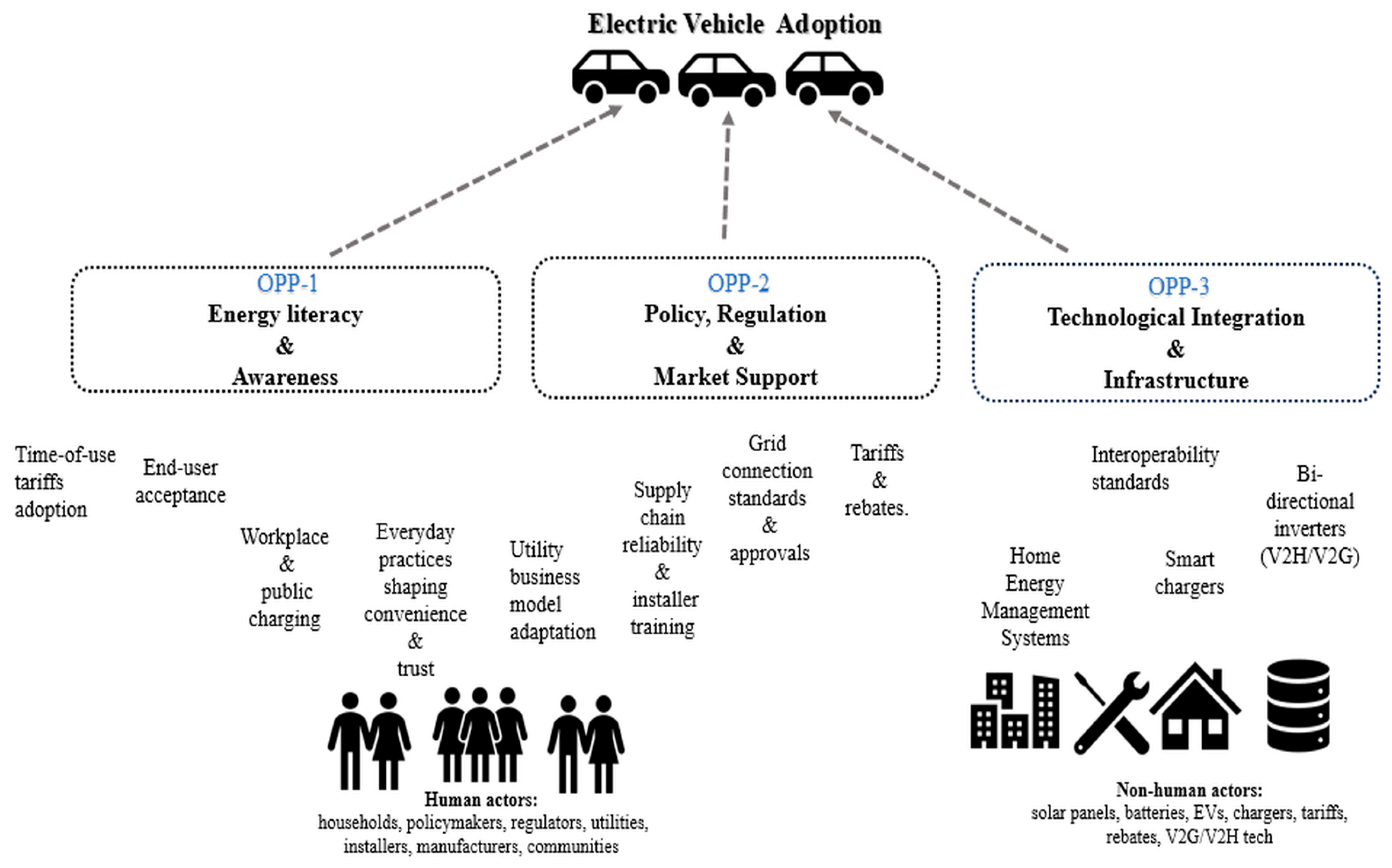 | “Vehicle-to-Home and Vehicle-to-Grid will make EV adoption a no-brainer… the car is your household battery” P4. “V2X is overhyped; home batteries are cheaper and simpler” P6. “Consumers are now becoming active energy managers” P15. | V2H/V2G; EV as household battery; | EVs redefined as mobile storage; end-user transition from passive drivers to energy managers | EV redefinition & consumer transformation | Translation | Shaping how actors see themselves and their technologies, creating new value and meaning |