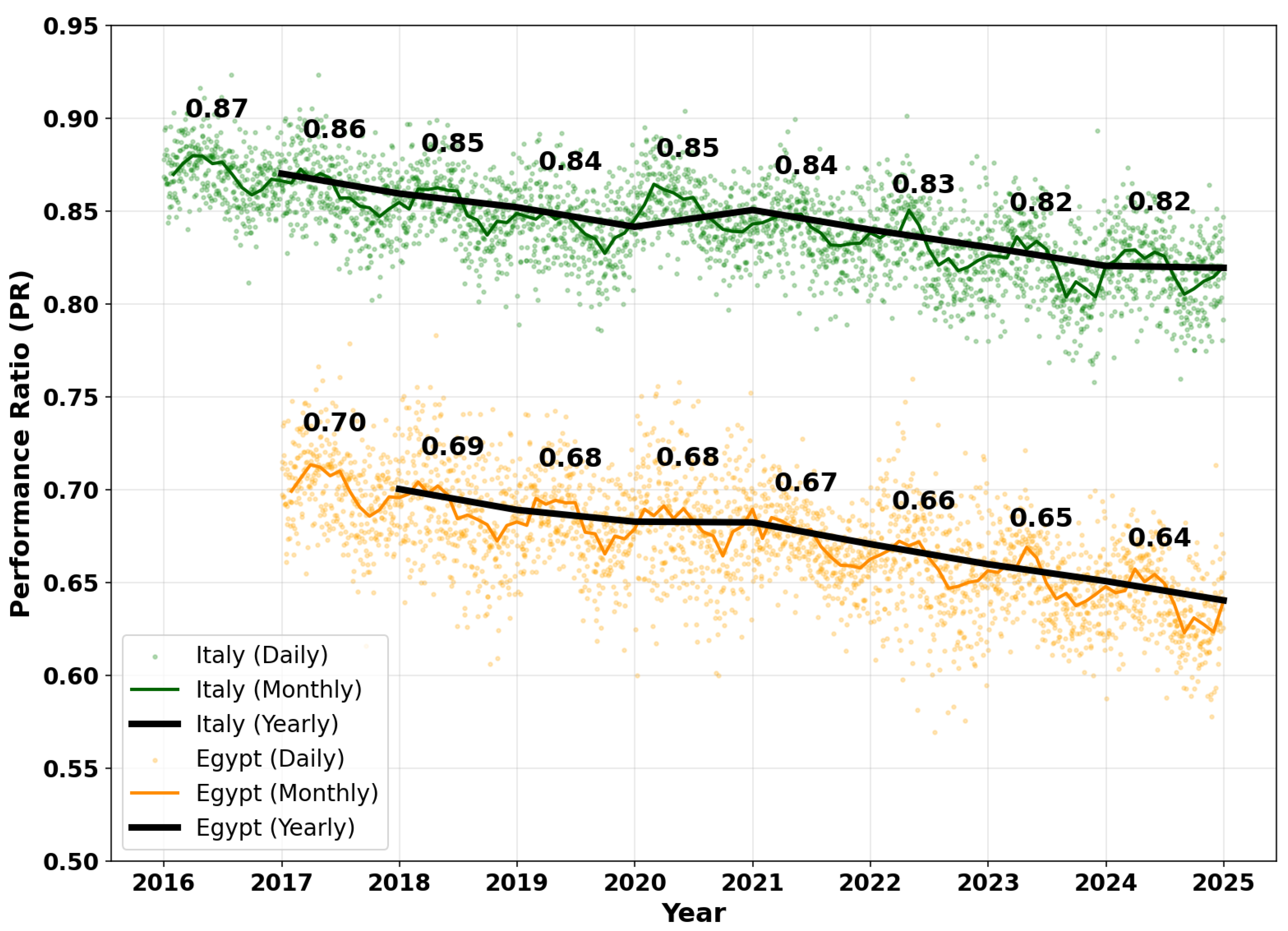 2.2. Analysis of Performance Ratio and Degradation Rates