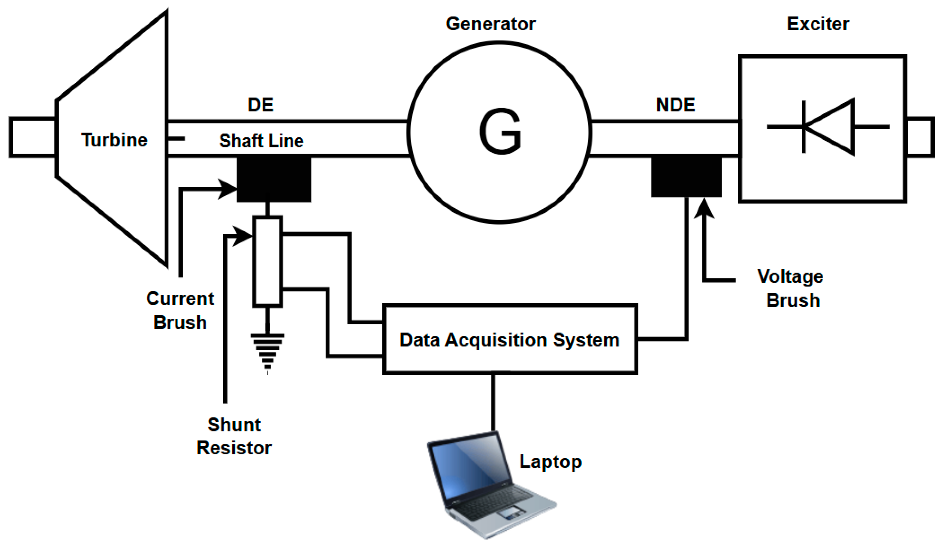 Figure 1. Turbine generator experimental setup with associated instrumentation systems used to measure shaft current and voltage signals.
