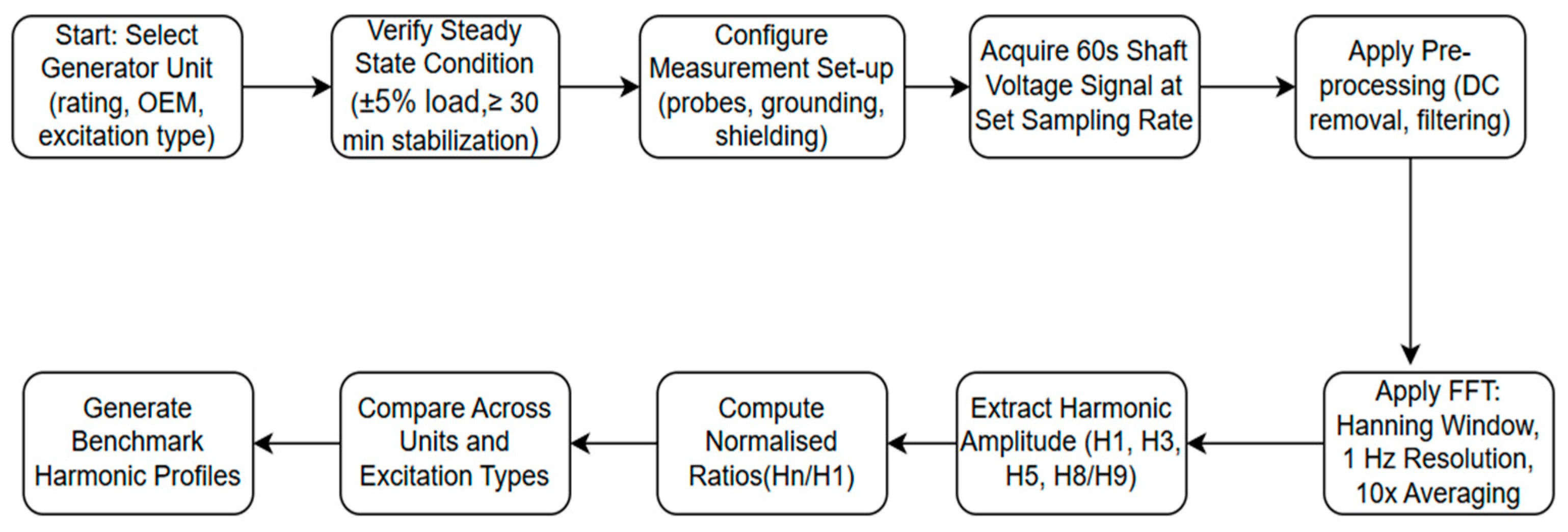 Figure 2 illustrates the complete diagnostic workflow used in this study to obtain, process, and compare shaft voltage harmonic characteristics. The flowchart ensures that the procedure is repeatable, standardized, and can be applied across multiple power stations. The flowchart illustrates the sequence used to transform raw shaft voltage measurements into harmonic features suitable for comparison across generators. First, the raw waveform undergoes pre-processing (DC removal, windowing), followed by FFT computation using a Hanning window with 1 Hz resolution and spectral averaging. From the FFT spectrum, the magnitudes of the fundamental and dominant harmonics (H1, H3, H5, H8/H9) are extracted, and normalized harmonic ratios (Hn/H1) are computed. These ratios form the basis for cross-unit harmonic fingerprint comparison and excitation system classification.