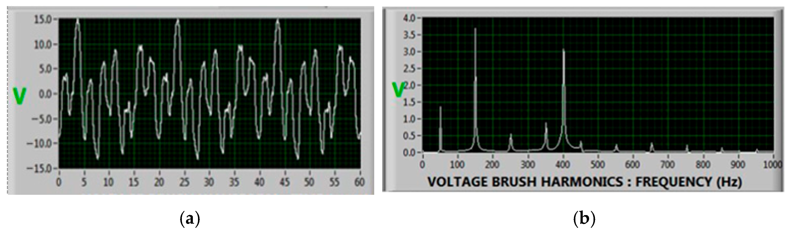 Figure 5. Power station C—(a) time-domain shaft voltage waveform (V); (b) shaft voltage spectrum obtained by FFT (frequency in Hz; magnitude in Vrms).