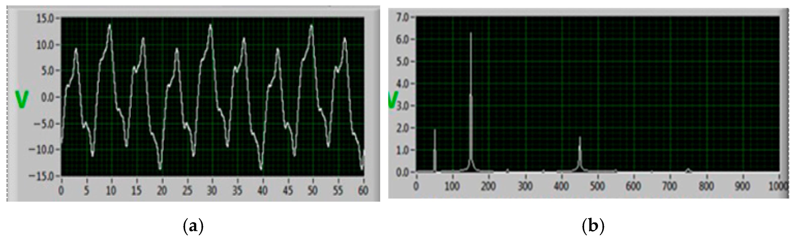 Figure 3. Power station A—(a) time-domain shaft voltage waveform (V); (b) shaft voltage spectrum obtained by FFT (frequency in Hz; magnitude in Vrms).