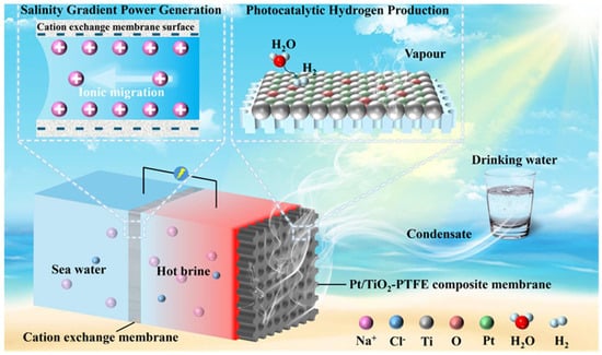 The design principle of the SWHE system is illustrated in Figure 1. A photothermal local heating interface was constructed with a polytetrafluoroethylene (PTFE) microporous hydrophobic membrane as the core. Deep gray Pt/TiO2, which exhibits high light absorption properties, was deposited on the PTFE membrane’s surface to serve as the IPHE module’s photocatalyst and the SIE module’s solar absorber. It is important to emphasize that the low surface energy of the PTFE membrane can effectively prevent the permeation of ions in liquid seawater, thus ensuring the stability of the photocatalyst. By coupling the evaporation interface with the photocatalytic hydrogen evolution interface, the full-spectrum utilization of solar energy can be achieved. Long-wave photons are absorbed to heat seawater and generate water vapor, providing raw materials for the IPHE module. Subsequently, a portion of the water vapor is cracked on the Pt/TiO2 surface under the action of short-wave high-energy photons, causing the hydrogen evolution reaction to occur, while the unreacted water vapor is collected through the condensation wall. Meanwhile, the successive evaporation of seawater causes a constant accumulation of concentration near the evaporation interface, which is significantly higher than that in the bulk seawater area. This salinity gradient energy caused by evaporation can be recovered through an RE module for electric output. Due to the concentration potential difference, cations in seawater form a directional migration through the cation exchange membrane (Nafion 117) to form a potential difference, and then the electric energy caused by ion migration is output (Ag/AgCl). The specific structure of the device is elaborated in the Supplementary Materials, Figure S1.