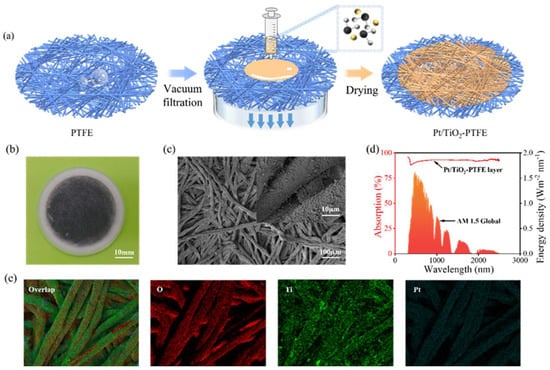 Preparation and characterization of the Pt/TiO2–PTFE composite membrane: (a) Preparation steps of the composite membrane; (b) Physical image of the composite membrane; (c) SEM image of the composite membrane; (d) Composite membrane’s absorption spectra in the solar band; (e) Energy spectrum of Pt/TiO2 on the surface of the composite membrane.