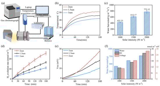 Assessment of the water, hydrogen, and electricity generation capabilities of the SWHE in the laboratory setting: (a) Experimental test system layout; (b) Variation in temperature within the seawater distillation chamber under varying light intensities; (c) The SWHE’s water production rate under varying light intensities; (d) Hydrogen yield of the SWHE with varying light intensities; (e) Voltage fluctuations of the SWHE with varying light intensities; (f) Summary of the water–hydrogen–electricity outputs of the SWHE with varying light intensities.