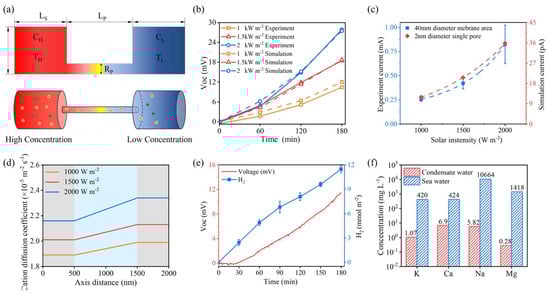 Simulation of the RE module and operational conditions of the SWHE device under seawater conditions: (a) RE simulation model; (b) The variation in the simulated voltage and actual voltage of the device at various light intensities; (c) Comparing the experimental current and simulated current under varying light intensities; (d) Ion diffusion coefficient along the pore axis; (e) Hydrogen and electricity generation capacity of the SWHE device under the light intensity of 1-sun irradiation; (f) Comparison of ion concentrations in condensate water and seawater for the SWHE device.