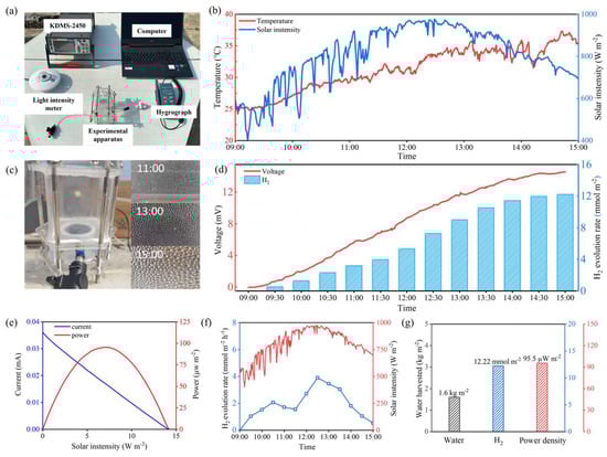Figure 5b shows that the average daily light intensity was 803 W·m−2 while the average ambient temperature was 31.36 °C. The SWHE is exposed to sunlight, allowing water vapor to pass through the Pt/TiO2–PTFE composite membrane and condense on the wall surface, thereby transforming into water droplets to be collected (Figure 5c). Figure 5d shows the variation in hydrogen generation and voltage during the operation of the SWHE device. Eventually, 12.22 mmol m−2 of hydrogen was collected. In addition, a 14.56 mV open-circuit voltage as well as a 0.095 mW·m−2 highest power density were attained (Figure 5e). It is worth noting that the hydrogen production rate fluctuates with the variation in light intensity, as shown in Figure 5f. At the peak solar intensity period of 12:30 (0.97 kW m−2), the hydrogen evolution rate reached a peak of 3.9 mmol·m−2·h−1, indicating that the fluctuation of light intensity directly affects the carrier separation efficiency of the photocatalytic active sites. After 6 h of outdoor operation, SWHE achieved the water production of 1.6 kg·m−2, hydrogen generation of 12.22 mmol·m−2, and a maximum output power of 95.5 µW m−2 (Figure 5g). The outdoor experimental results fully demonstrate that the SWHE device can stably produce freshwater, hydrogen, and electricity in an environment with fluctuating natural solar intensity and temperature changes.