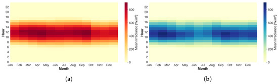 The study uses the Data Access Viewer (DAV) database from the National Aeronautics and Space Administration (NASA) [59], which, through an Application Programming Interface (API), provides wind speed, wind direction, ambient temperature, and solar irradiance in a selected area with a resolution of one hour for each data sample. Two regions of Colombia are chosen as case studies based on data from the Institute of Hydrology, Meteorology, and Environmental Studies (IDEAM, by its Spanish acronym) [60,61]. The resources in the selected zones are considered due to their complementarity and the high diversity of renewable resources in Colombia. These areas are also chosen as representative examples of Non-Interconnected Zones (NIZ), where access to electricity is limited and diesel generators are often used as the primary power source, enabling an assessment of how these approaches can support the energy transition. One of them is in Uribia in the department of La Guajira, due to its average surface wind speed between 7.0–8.0 m/s, and an average global solar radiation between 5.5–6.0 , being an area with high energy resources. On the other hand, near the municipality of Arauca in the department of Arauca, it was selected due to its average surface wind speed between 0.5–1.0 m/s and average global solar radiation between 5.5–6.0 , which represents low wind resources but high solar irradiance. Figure 2a shows the probability distribution of wind speed for the year 2023 for both selected regions, while Figure 2b shows the wind speed with a resolution of one hour for the same year. Finally, Figure 3 shows a solar radiation heatmap with an hourly resolution in the year 2023.
