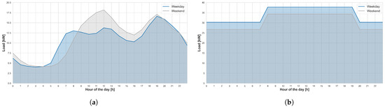 Electricity demand profiles for weekdays and weekends: (a) Household demand profile-Load (1). (b) Industrial demand profile-Load (2) [62].