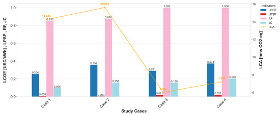 Comparison of case studies based on economic, technical, social, and environmental indicators for industrial load profile.