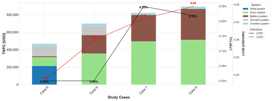 Based on the results shown in the comparison between demand profiles and resources by region, the LPSP and LCOE indicators reveal a strong dependence on weather variations and the electricity demand profile. For this analysis, cases with the same system configuration and electricity demand are compared. In the comparison between Case 1 and Case 2, the LCOE increases from 0.2543 to 0.3592 USD/kWh, reflecting higher investment costs due to lower wind and solar resources. However, the LPSP improves from 0.87% to 0.31%, suggesting that, although the generation cost increases, the system operates with greater reliability, attributable to the sizing of diesel backup and storage that compensate for resource limitations. For Case 3 vs. Case 4, the LCOE sensitivity is higher, increasing from 0.2908 to 0.3738 USD/kWh. The LPSP remains similar, confirming that weather conditions in Arauca directly affect the LCOE, indicating that more funds need to be invested to ensure similar technical performance. In contrast, in Case 5 compared to Case 6, the LCOE increases from 0.2328 to 0.3483 USD/kWh, once again demonstrating the dependence of costs on resource availability. The LPSP remains at 0%, indicating that the EMS guarantees complete reliability despite lower renewable production, albeit at a significantly higher cost, which increases the LCOE. Finally, Case 7 vs. Case 8 shows that to achieve similar technical performance in the Arauca region, investment needs to be increased due to meteorological uncertainty, resulting in more solar panels, longer autonomy, and a higher nominal power of the diesel generator. The comparison between regions and load types shows that configurations with diesel generation achieve lower LPSP and LCOE, providing greater reliability at the cost of increased emissions. In contrast, fully renewable configurations have higher costs and occasional supply deficits when resource availability is low. This reveals that reducing LPSP values generally results in a higher LCOE in most system configurations. While this cost reduction improves economic efficiency, it comes at the expense of the technical reliability of the system.