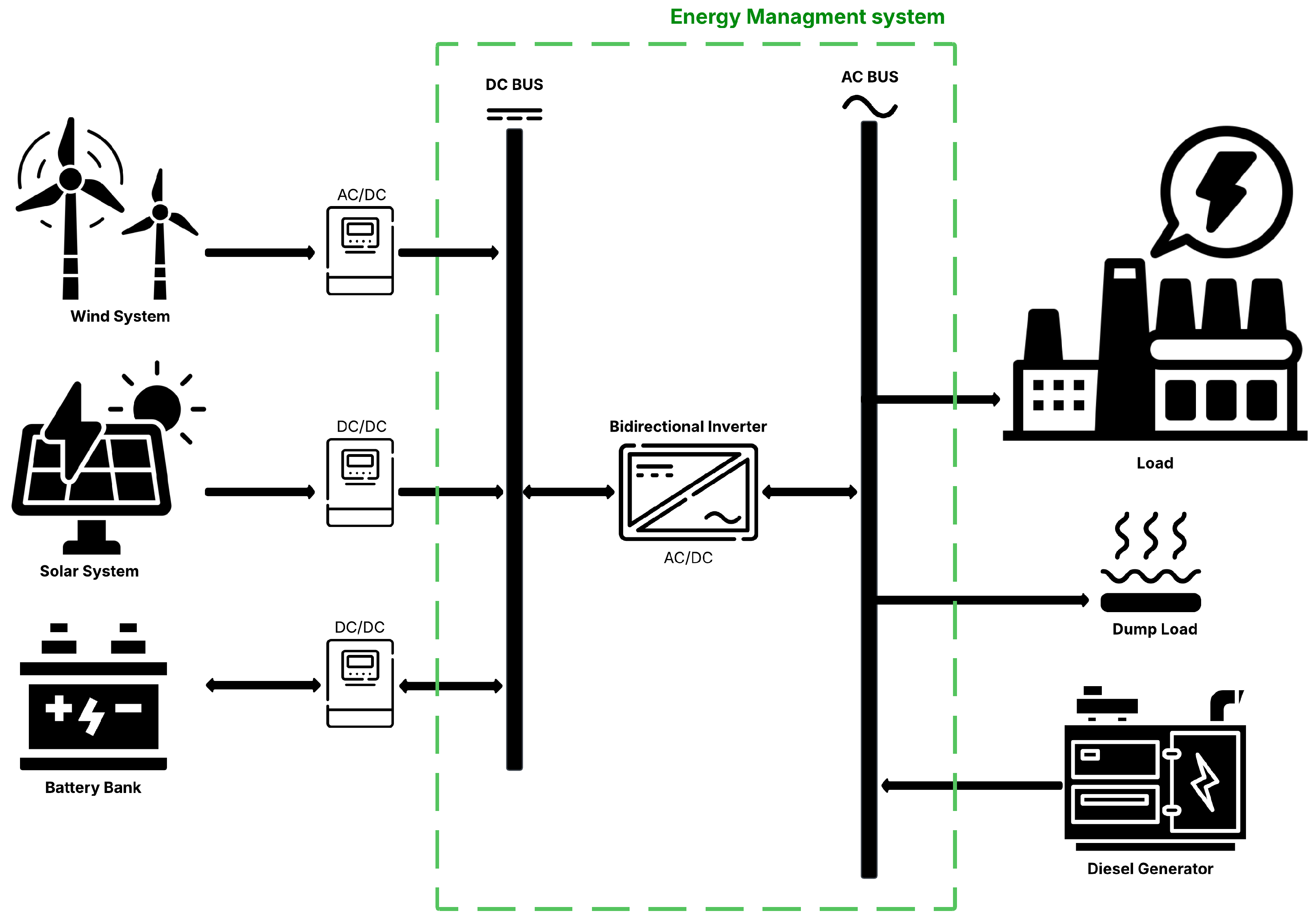 To address this issue, researchers have focused on implementing Hybrid Renewable Energy Systems (HRES), which integrate multiple Renewable Energy Sources (RES) with Energy Storage Systems (ESS) to complement each other at times of low energy production [12,13,14]. The integration of diverse Renewable Energy Sources (RES) mitigates the weaknesses of individual technologies by leveraging the strengths of others. Furthermore, accurate resource forecasting contributes to stabilising power distribution and enhancing the balance between supply and demand [15,16,17]. ESS, including batteries, fuel cells, flywheels, supercapacitors, molten salts, compressed air, and pumped hydroelectric storage, helps mitigate supply intermittency by storing energy in electrical, potential, or thermal form for use when demand exceeds supply [18]. In this context, microgrids face challenges such as low inertia, high renewable penetration, and harsh environmental conditions, which can lead to uncertain operating states and reduced stability [19]. Therefore, to ensure continuity of power supply, an Energy Management System (EMS) is essential as a supervisory control layer that governs source–load interactions by coordinating charging, discharging, and surplus allocation according to system demands. Effective control of energy flows among various generation and storage technologies helps reduce operational costs and mitigates instability associated with resource intermittency. Consequently, the ESS must be supported by an appropriate management strategy to ensure supply security [20].