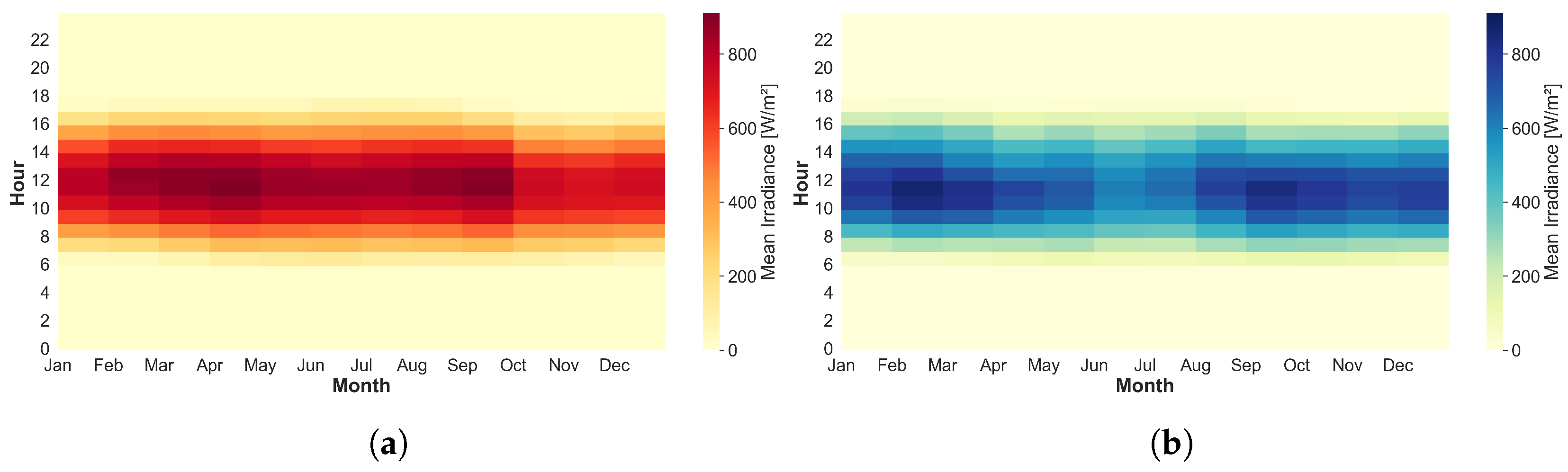 Figure 3. Solar irradiance in selected areas for the year 2023: (a) La Guajira Heatmap. (b) Arauca Heatmap.