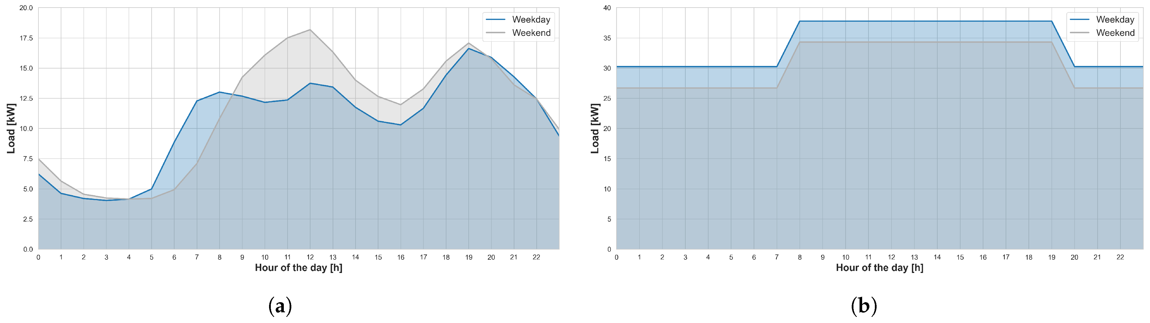 Figure 4. Electricity demand profiles for weekdays and weekends: (a) Household demand profile-Load (1). (b) Industrial demand profile-Load (2) [62].