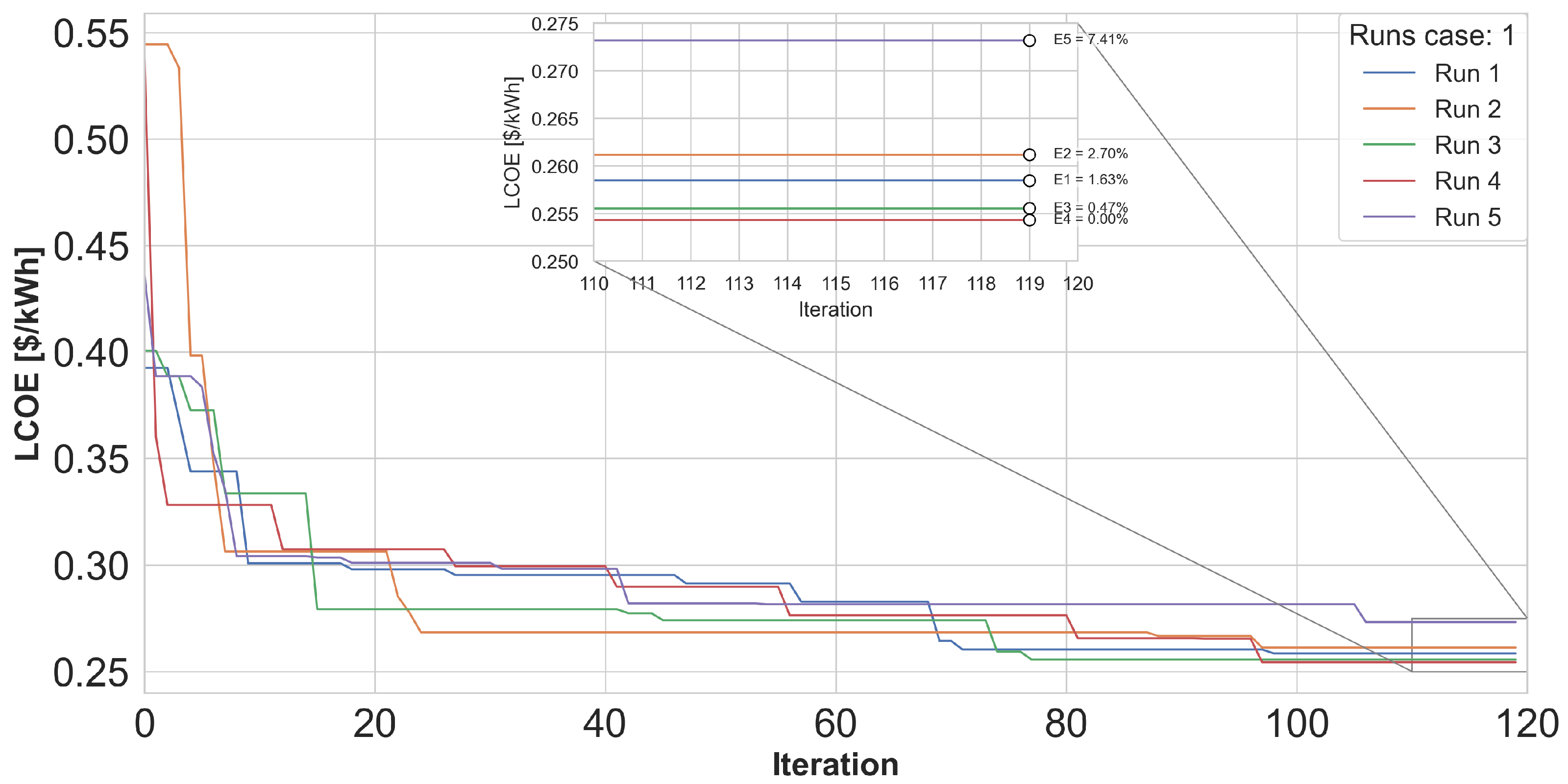Figure 5. Convergence of the global best LCOE value for the proposed PSO-based model: Case 1.