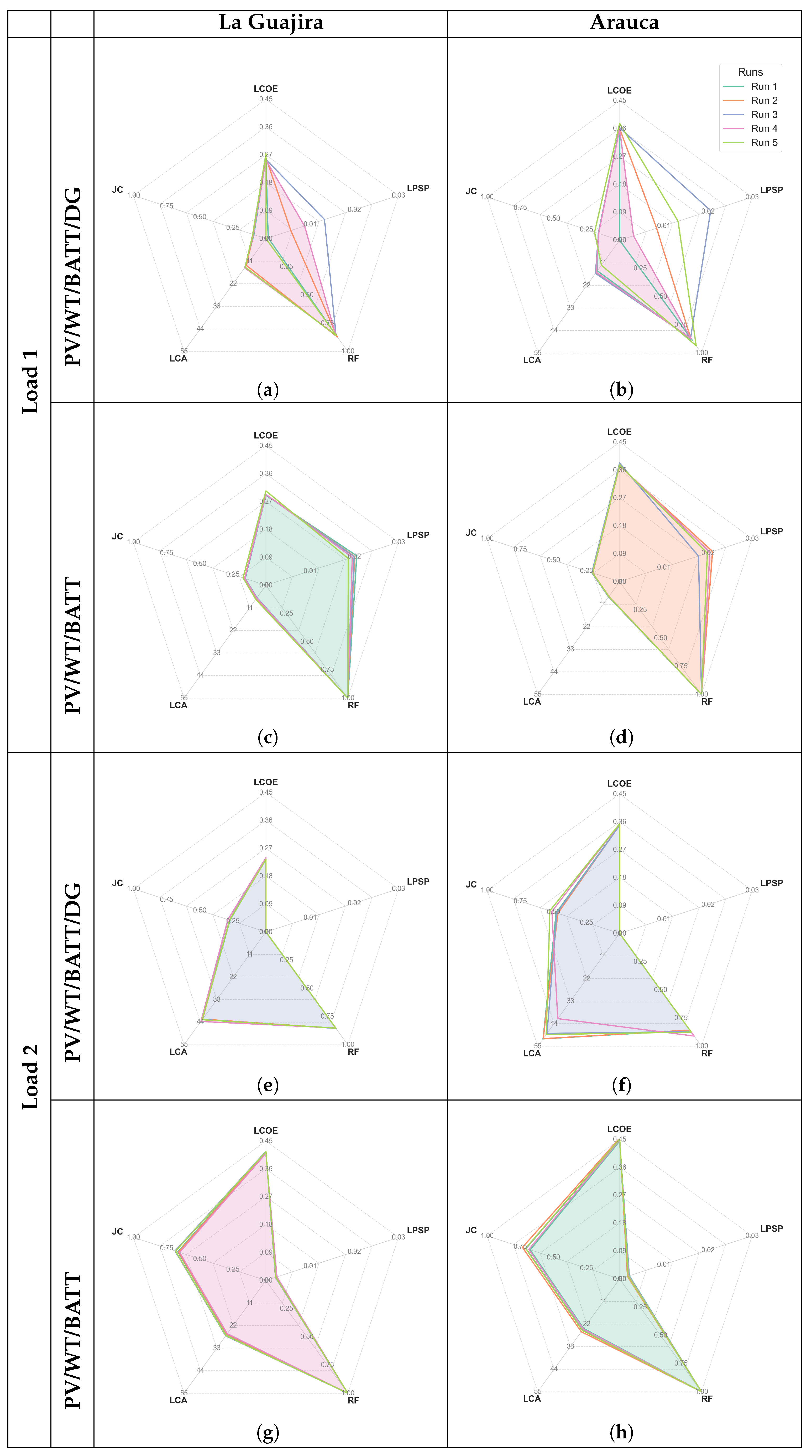 On the other hand, Atawi et al. [29] optimised an HRES model comprising PV panels, wind turbines, and storage in batteries and a water reservoir (PHES) technologies using the Multi-Objective Optimisation algorithm African Vultures (MOAVOA). The optimisation considered two objective functions: Total Annual Cost (TAC) and yearly amount of Expected-not-Served Energy (EENS). The performance of MOAVOA was compared with the NSGA-II and MOPSO algorithms, obtaining solutions that were evaluated using mean weighting, entropy, and the importance of criteria using the correlation between criteria method (CRITIC), followed by the decision-making method (TOPSIS) to select the best system design. Adetoro et al. [6] performed a comparative analysis of the performance of three metaheuristic algorithms (ABC, GA, and PSO) in optimising an HRES connected to an unreliable electrical grid. The study defined minimising the Levelized Cost of Energy (LCOE) as its objective function and considered EMS strategies to coordinate dispatch among PV/WT/BATT/DG/BG technologies and the grid. The results showed that the PSO algorithm achieved the best performance, yielding the lowest LCOE, indicating that it maintained a good balance between exploration and exploitation. Mohammed et al. [30] optimised an HRES composed of wind turbines/tidal turbines/PV modules/batteries to supply the electricity demand of a remote area in Brittany, France. They used a modified PSO algorithm to minimise the total net present cost (TNPC). The algorithm achieved high-precision, high-speed solutions with only 20 iterations, resulting in shorter execution time than other conventional techniques.