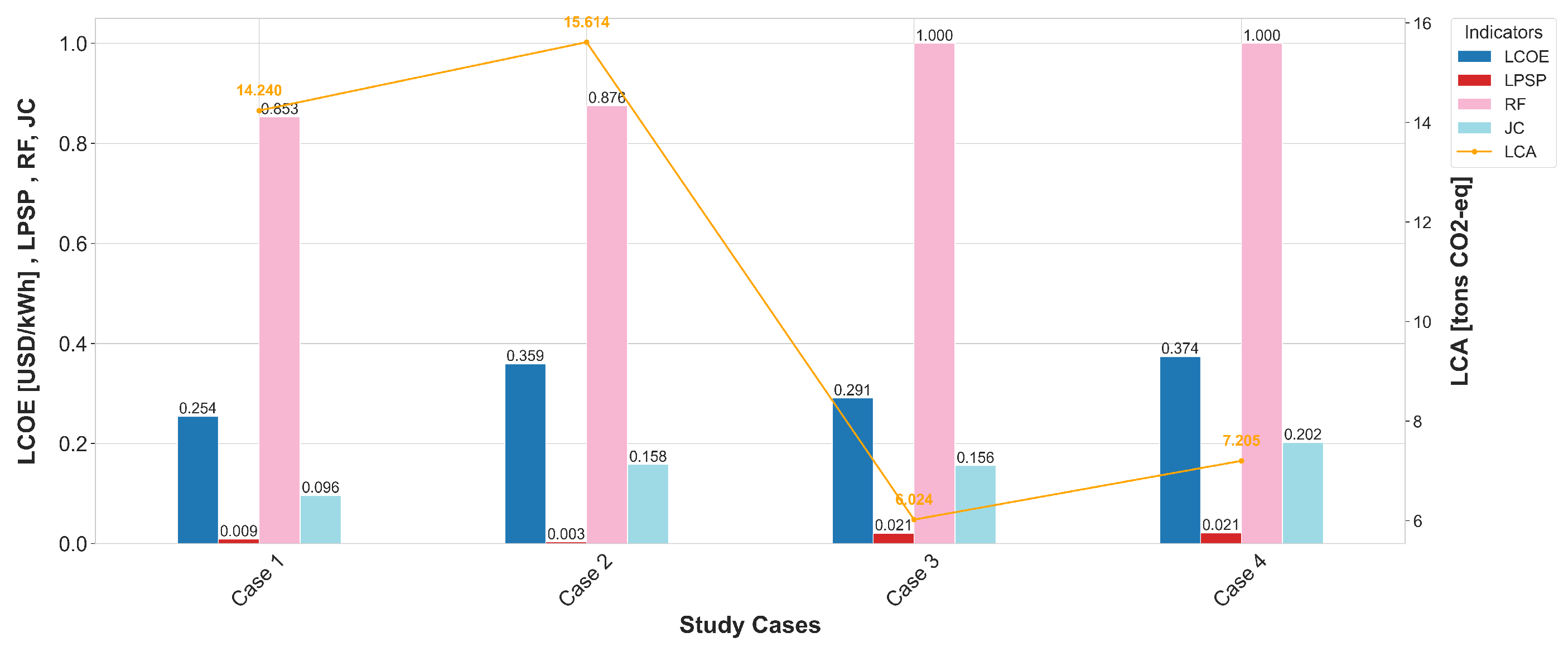 Figure 14. Comparison of case studies based on economic, technical, social, and environmental indicators for industrial load profile.