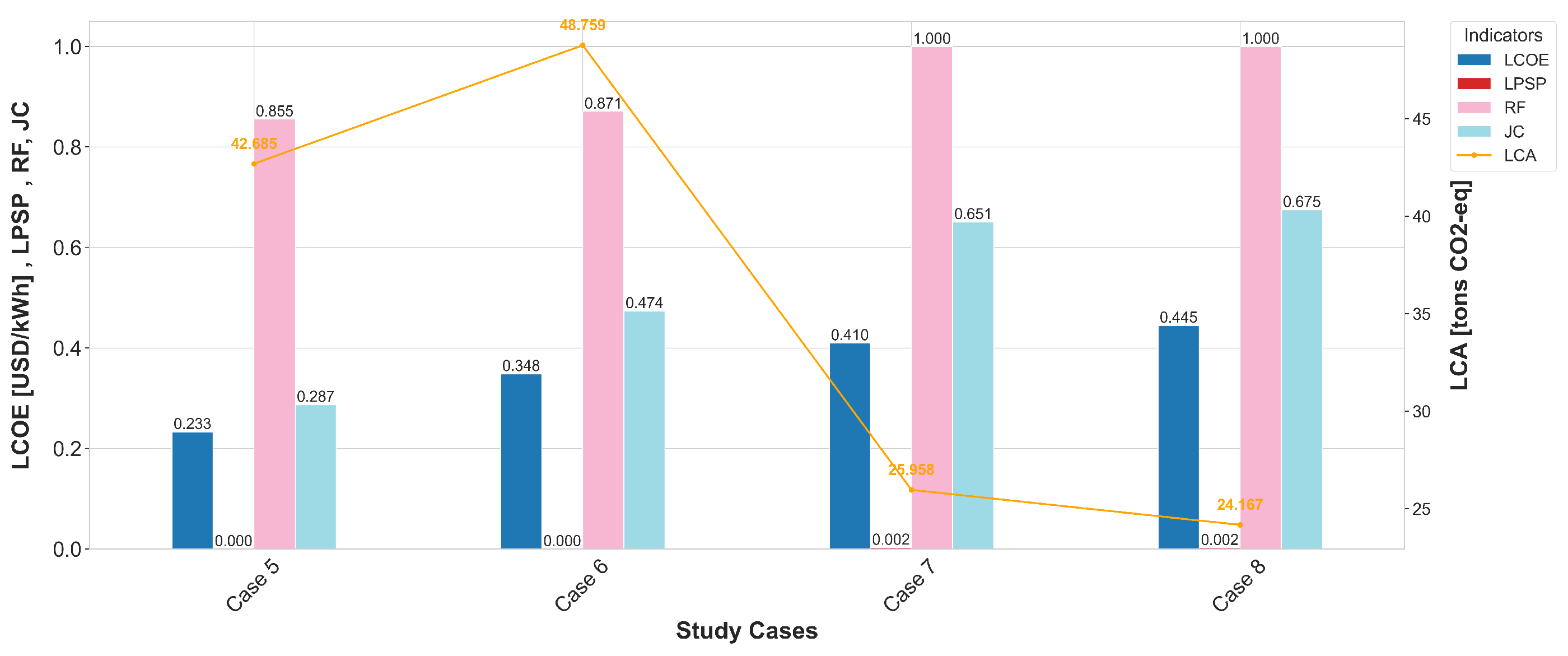 Figure 12. Comparison of case studies based on economic, technical, social, and environmental indicators for household load profile.