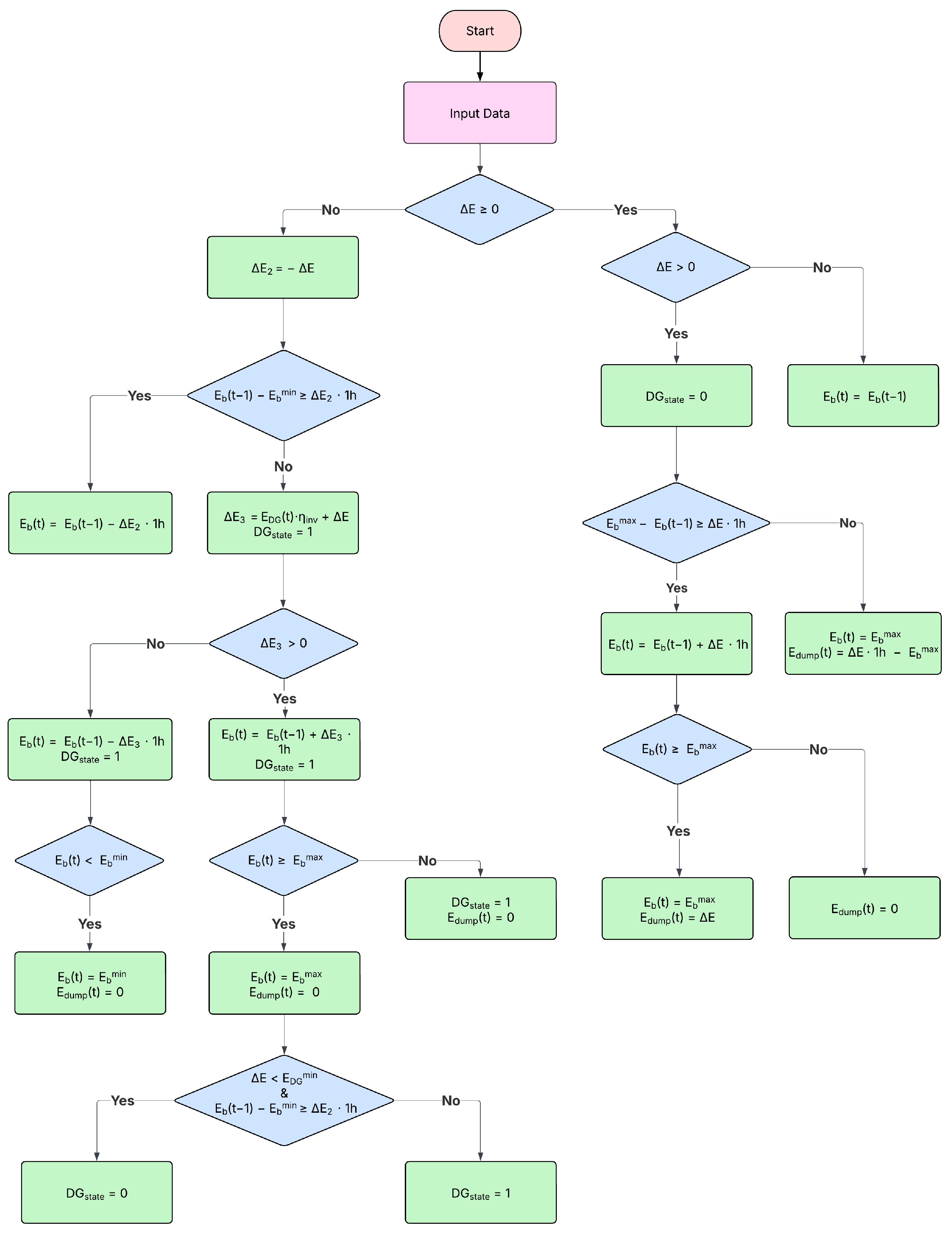 E b ( t ) = E b ( t 1 ) · ( 1 σ ) Δ E · 1 η d i s Δ t , if Δ E < 0 , E b ( t 1 ) · ( 1 σ ) + Δ E · η c h Δ t , if Δ E > 0 ,