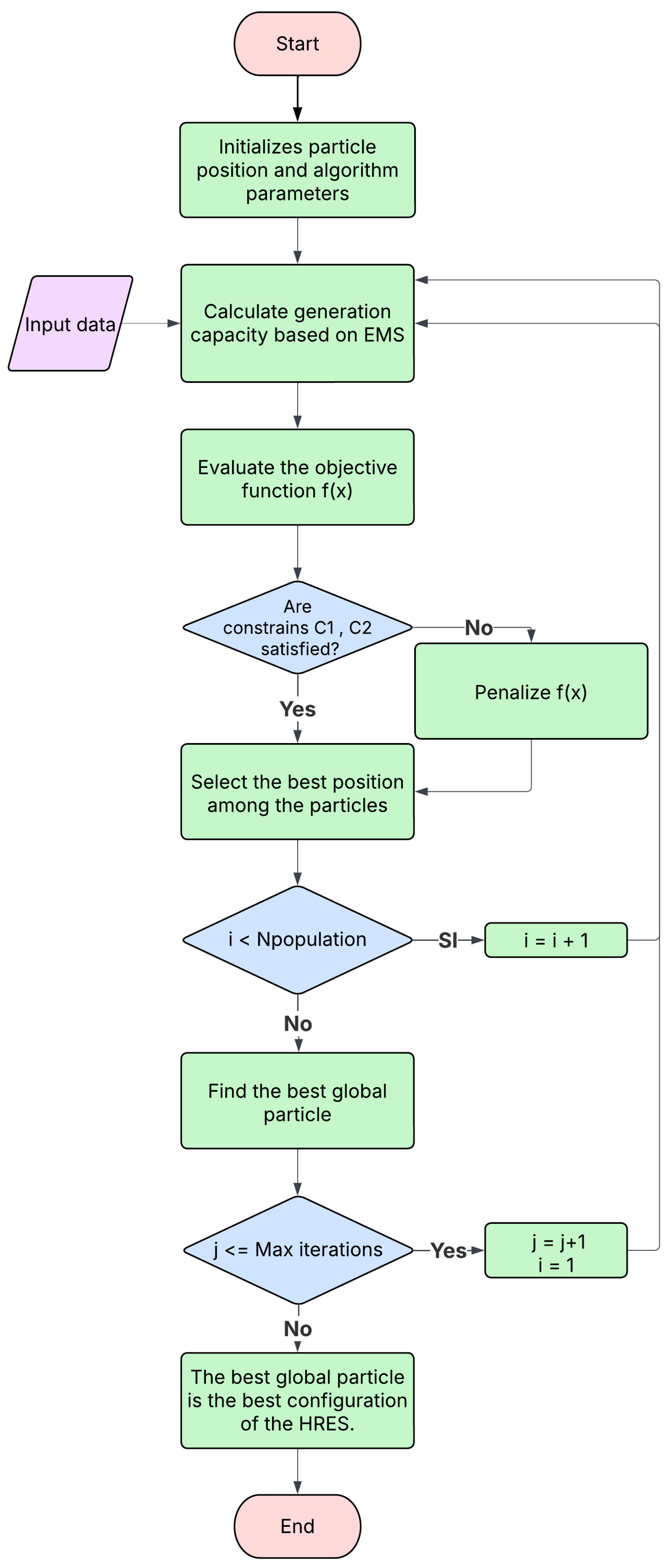 Mathematical optimisation is the process of determining the best solution to a problem by maximising or minimising an objective function, subject to given constraints and alternatives [21]. Bamisile et al. [22] indicates that optimisation problems can be divided into those where it is necessary to maximise and those where it is required to minimise, considering the constraints that limit the solutions obtained. Modu et al. [23] identify three approaches for sizing HRES: 1. Classical optimisation techniques based on differential calculus, including iterative, probabilistic, and graphical methods, among others. 2. New optimization methods of soft computing, which use artificial intelligence and hybrid approaches and can determine the global optimum of the system, offering better convergence and accuracy in the search for solutions; notable examples include metaheuristic algorithms such as Genetic Algorithms (GA), Particle Swarm Optimization (PSO), Artificial Bee Colony (ABO), as well as multi-objective, Multi-Objective Particle Swarm Optimization (MOPSO), Genetic Sorting Algorithm (NSGA-II), among others [6,22]. 3. Commercial computer software packages for hybrid systems: these tools are available under commercial licenses, and implement single-objective optimisation strategies to minimise the objective function costs. Some examples includes HOMER (Hybrid Optimisation of Multiple Energy Resources [24], iHOGA (Improved Hybrid Optimisation via Genetic Algorithm) [25] and RETScreen [26].