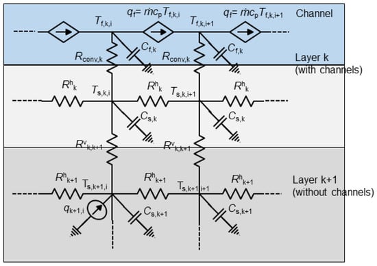 A fragment of the mathematical model simulated using TIMiTIC []. Note that the full model is three-dimensional, but in this figure, it is presented in two dimensions for clarity. Tf: fluid temperature at a given node; Ts: solid temperature at a given node; Rh: horizontal thermal resistance; Rv: vertical thermal resistance; Rconv: convection resistance between solid and fluid; Cf: fluid node capacitance; Cs: solid node capacitance: q: heat source power; qf: heat flow due to advection; : mass flow; cp: fluid specific heat.