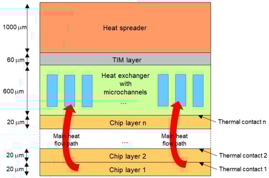 The general structure of the 3D stack used in this study is shown in Figure 4, and it is based on AMD’s Zen processor design. As complete information about this design is not available, some parameters had to be assumed. The entire chip has an area of 15 mm × 15 mm. At the bottom of the stack, two or more chip dies are present, each with a height of 20 µm. Thermal contacts between chip dies are introduced to account for the additional thermal resistance between dies due to bonding and BEOL layers. The topmost silicon die is unthinned, has a height of 600 µm, and is oxide-bonded on top of the last chip die. It contains 40 straight microchannels, each measuring 250 µm × 400 µm in cross-section, stretching across the entire length of the chip. The inlet fluid temperature is fixed at 300 K and is used as a reference for the calculation of temperature increases in other locations. The inlet fluid velocity is a variable parameter in the analysis. The fluid–solid convection mechanism is simulated as thermal resistances between the solid and the fluid, and each resistor value is calculated based on the heat transfer coefficient (HTC) in the respective microchannel area. The Hausen correlation [] (adapted to rectangular channels) is used to calculate the Nusselt numbers as a function of the distance from the inlet, which are needed to calculate all HTCs along all channels. The movement of the fluid is simulated by temperature-controlled heat sources added to the model, and their parameters are calculated based on fluid properties and velocity. The heat spreader layer and thermal interface layer (TIM) were also included in the model because, from the thermal perspective, the heat spreader may be useful for rendering the chip’s temperature more spatially uniform. However, it should be noted that the impact of these two layers on the conclusions presented in this study is most likely minimal. The summary of all simulation parameters is provided in Table 1. The boundary conditions are listed in Table 2.