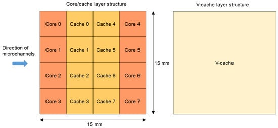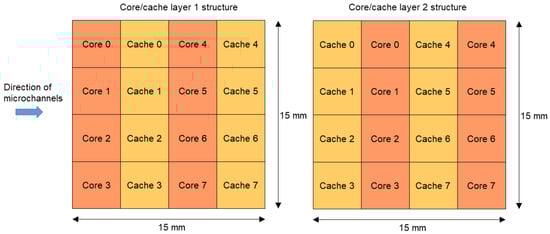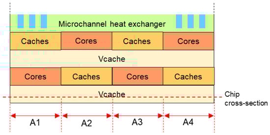 In this section, two designs, Z1 and Z2—as shown in Figure 5—are compared. In both designs, the processor is composed of two dies: the core/cache die and the V-cache die. The only difference between the designs is the positioning of cores and V-cache in the 3D stack; in the Z1 design, the cores are located at the bottom of the stack, while in the Z2 design, the cores are located at the top, close to the microchannel’s heat exchanger. The Z1 design is a better solution from the perspective of implementing interconnections and routing, but the Z2 design is likely to be superior from a thermal perspective. In what follows, we attempt to quantify how the Z2 design is better compared to the Z1 design in terms of thermal performance. Figure 6 shows the positioning of cores, caches, and V-cache in the chip with respect to microchannels.