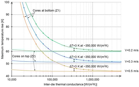 Figure 7 shows the maximum chip temperature increase as a function of inter-die thermal conductance (expressed in W/(m2 K)) for three cases of inlet fluid velocity values—0.2 m/s, 0.3 m/s, and 0.5 m/s, which correspond to around 0.95 kPa, 1.42 kPa, and 2.37 kPa of pressure drop, respectively. The bottom horizontal curves represent the results for the design in which processor cores are located at the top of the stack (closer to the microchannels), while the top curves are the results for the design in which processor cores are located at the bottom of the stack. Curves of the same color (green, blue, or orange) represent the results for the same case of inlet fluid velocity. The first observation is that, as expected, increasing the fluid velocity reduces the maximum chip temperature. For example, for high inter-die thermal conductance, the maximum chip temperature increase was lowered by 16 K from 60 K to 44 K, when the velocity was changed from 0.2 m/s to 0.5 m/s. However, this occurs with diminishing returns; thus, it may be postulated that the highest reduction in temperatures occurs when advection resistance is the dominant part of the total chip’s thermal resistance. As fluid flow velocity is increased and advection resistance decreases, solid–fluid convection resistance starts to dominate, and an increase in flow velocity does not produce temperature reductions that are as high compared to before.