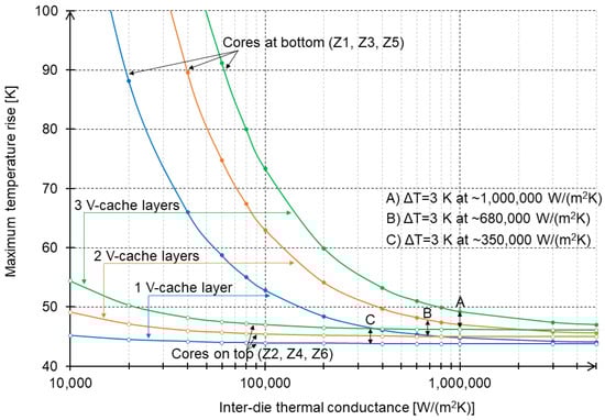 A second observation is that if cores are on top of the stack and close to the microchannels, the impact of the inter-die thermal conductance of the bonding layers on chip temperatures is minimal. This is also a logical outcome, as the power dissipated in the “buried” V-cache layers is substantially lower than the one dissipated in cores; thus, the relatively small heat flow from the bottom die—impeded by the increased thermal resistance—does not significantly affect the peak temperatures. On the other hand, in the case of the other design—with cores located at the bottom of the stack—the large heat flow from cores has to pass through the bonding/BEOL layer before it can be absorbed by the fluid; consequently, the impact of inter-die thermal conductance in this case is significant, as evidenced by sharply rising curves in the figure.