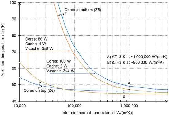 In this study, inter-die thermal conductance refers to the effective vertical conductance through the back end of line (BEOL) of the lower die and the bonding interface up to the active silicon of the upper die (Figure 2). In the case of Zen processors, the hybrid bonding manufacturing process ensures that the resulting bond will be very thin; thus, its conductance will be high. Consequently, the BEOL layer’s thermal conductance will be the dominant factor in the total inter-die thermal conductance. The problem is that the BEOL’s layer conductance is very difficult to estimate. Even knowing the layer’s thickness and the exact properties of the materials used may not be enough to precisely calculate the resulting thermal conductance. The reason is that this layer is composed not only of a dielectric but also of many metal interconnections. Additionally, the simplest approach of calculating the effective thermal conductivity only based on the dielectric/metal ratio can result in a vastly overestimated value, as most metal interconnections are horizontal, and vertical interconnections usually do not span across the entire layer. It is also worth mentioning that, in future 3D ICs, BEOL conductance may be artificially increased by implementing dedicated thermal vias [,,], which render it even more difficult to realistically estimate its value. Taking the above into consideration, we decided to use the value of inter-die thermal conductance as the most important variable parameter in this study, i.e., most results are calculated as a function of variable inter-die thermal conductance.