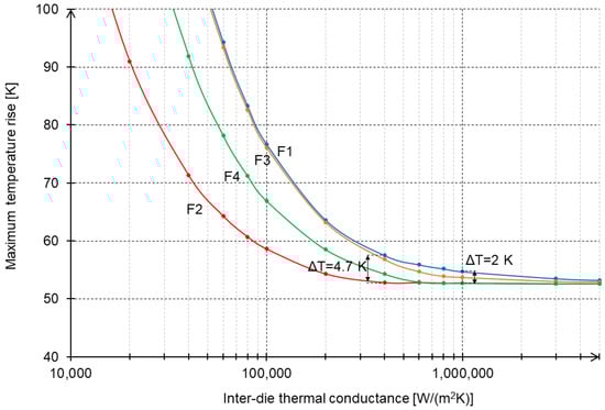 The reason for the strange phenomenon observed in Figure 12 becomes clear. For high inter-die thermal conductance values, the maximum temperature increase in the chip occurs with respect to the bottommost die at the far outlet side. Its value depends almost uniquely on the total sum of powers dissipated in the A4 area. Since this sum is the same for all designs, the temperature increase for all designs is similar, and in the case of designs F2 and F4, the increase is almost identical. However, as the inter-die thermal conductance decreases below 600,000 W/(m2 K), the maximum temperature increase occurs at the local hot spot in the A3 area, and its value is primarily determined by the cores’ power density. This explains why the local hot spot temperatures of designs F1 and F3 in Figure 15 are the same, which translates to the same peak temperature increases for the designs in Figure 12 with respect to low inter-die thermal conductances.