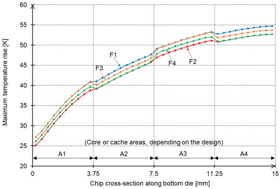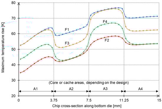 If the thermal conductance between dies is relatively high, heat flows freely between them. As shown in Figure 14, temperatures are very similar across all designs, although small differences in areas A1–A4 can be easily observed. These differences result from the fact that, for every area, the vertical positioning of units corresponding to the given area is different. Let us analyze one example for clarity. In the F4 design, above areas A1–A4, there are two V-cache units, one core unit, and one cache unit. However, for areas A1 and A3, the cores are “buried” deeper than the caches, and for areas A2 and A4, the opposite is true. This explains the slight changes in the shape of the curves in Figure 14 when transitioning between areas.