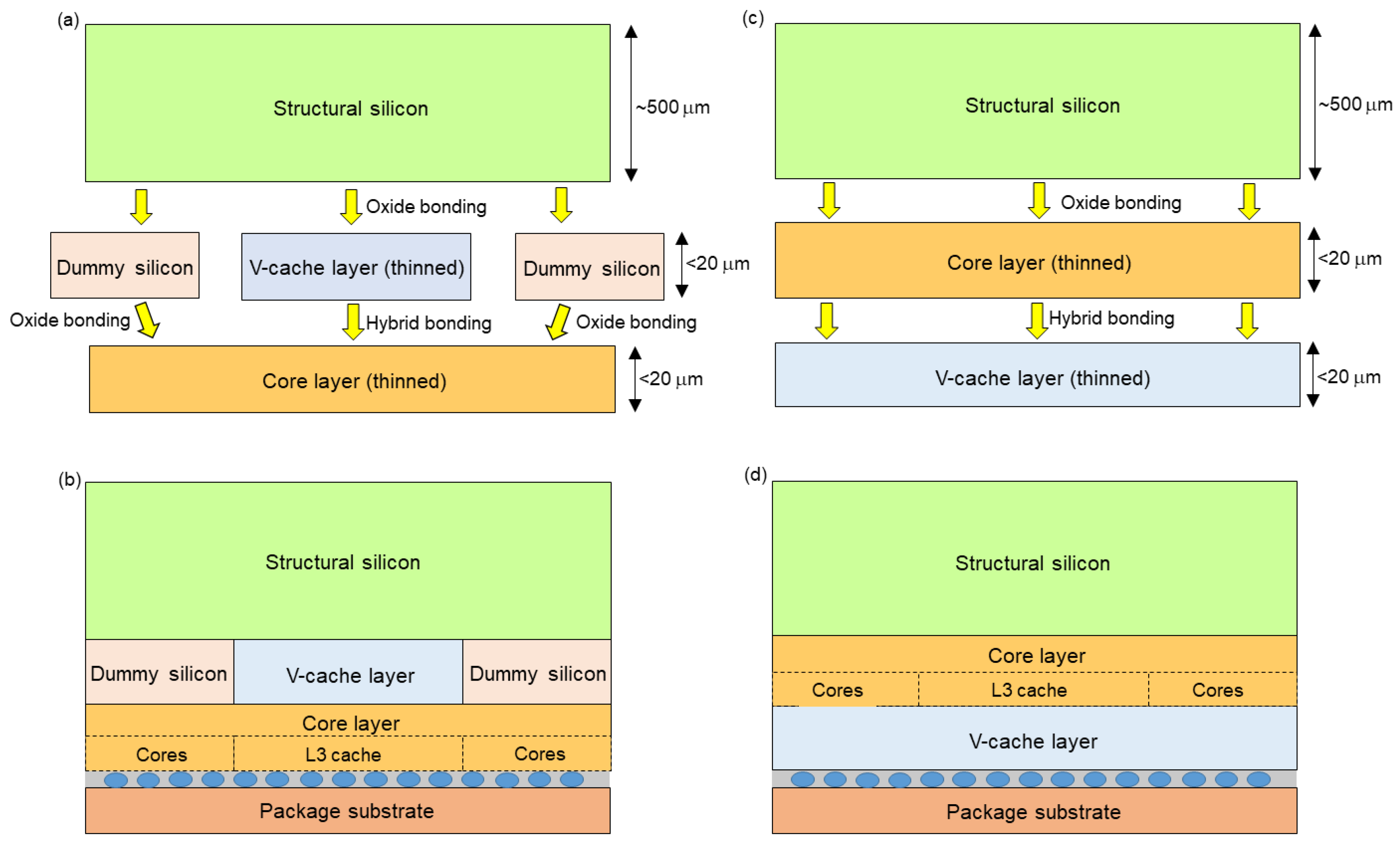 - Wuu, J.; Agarwal, R.; Ciraula, M.; Dietz, C.; Johnson, B.; Johnson, D.; Schreiber, R.; Swaminathan, R.; Walker, W.; Naffziger, S. 3D V-Cache: The Implementation of a Hybrid-Bonded 64MB Stacked Cache for a 7nm x86-64 CPU. In Proceedings of the 2022 IEEE International Solid-State Circuits Conference (ISSCC), San Francisco, CA, USA, 20–26 February 2022; Volume 65, pp. 428–429. [Google Scholar] [CrossRef]