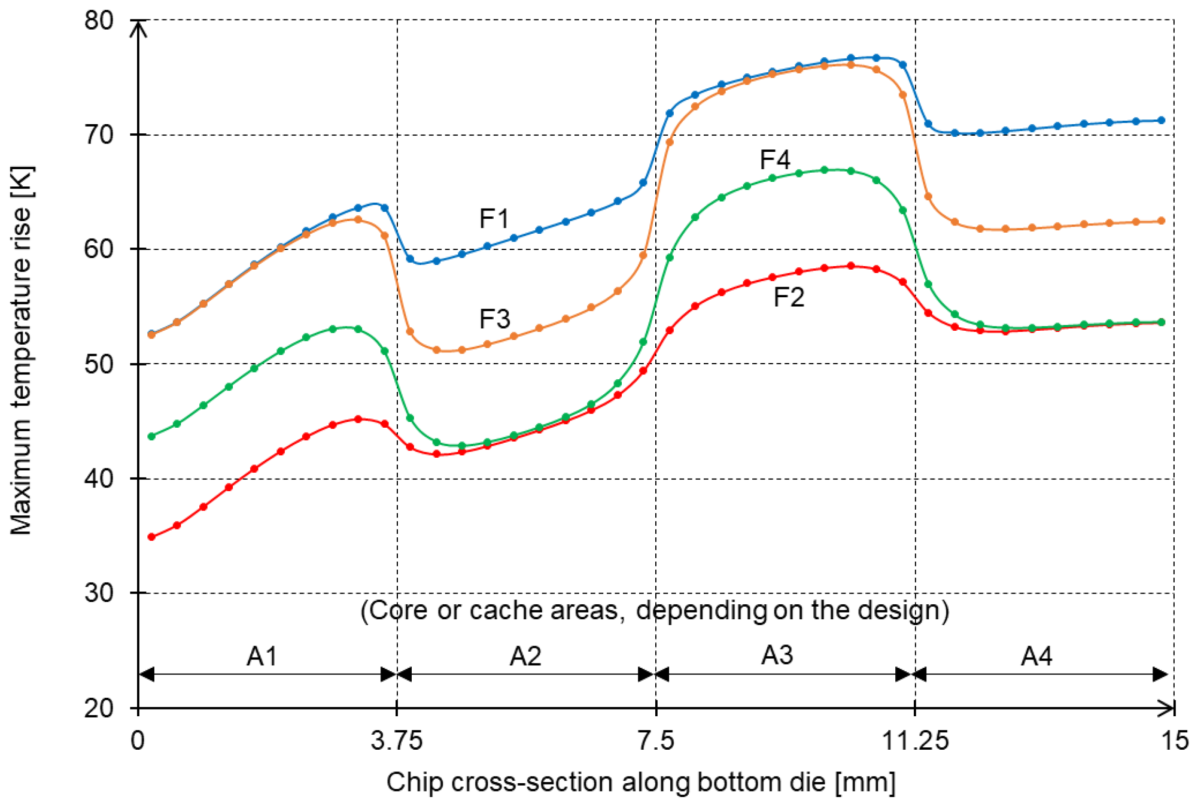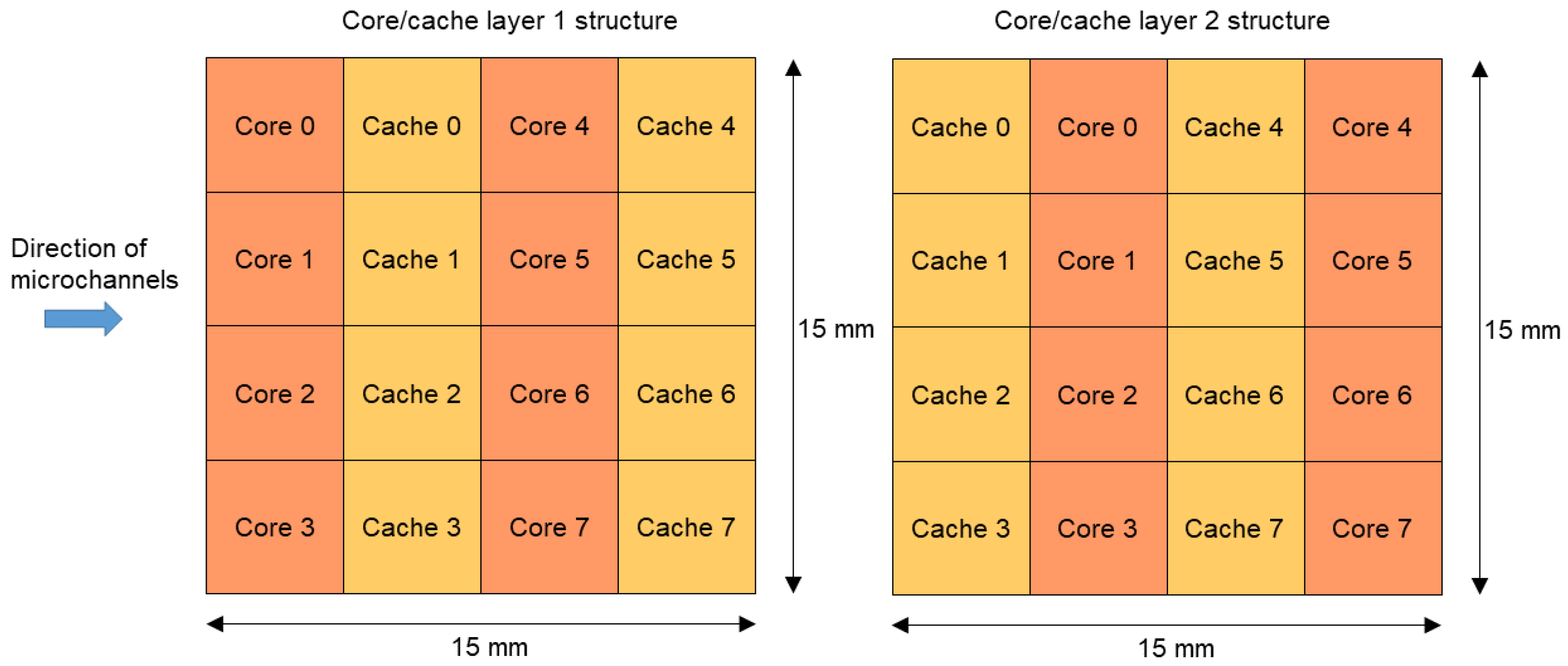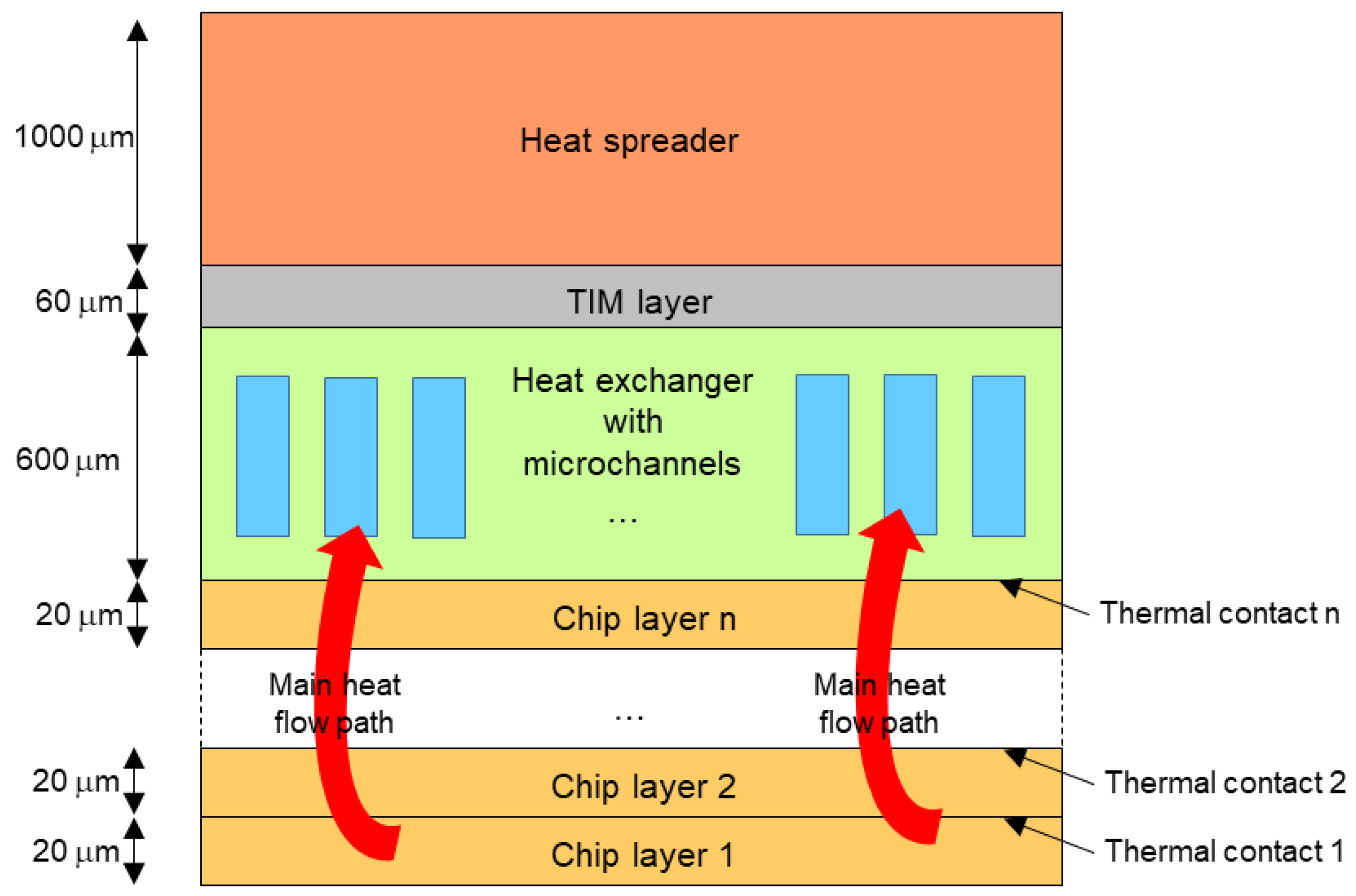 | Chip layer material | silicon, k = 130 W/(mK), = 2330 kg/(m3), = 700 J/(kgK) |