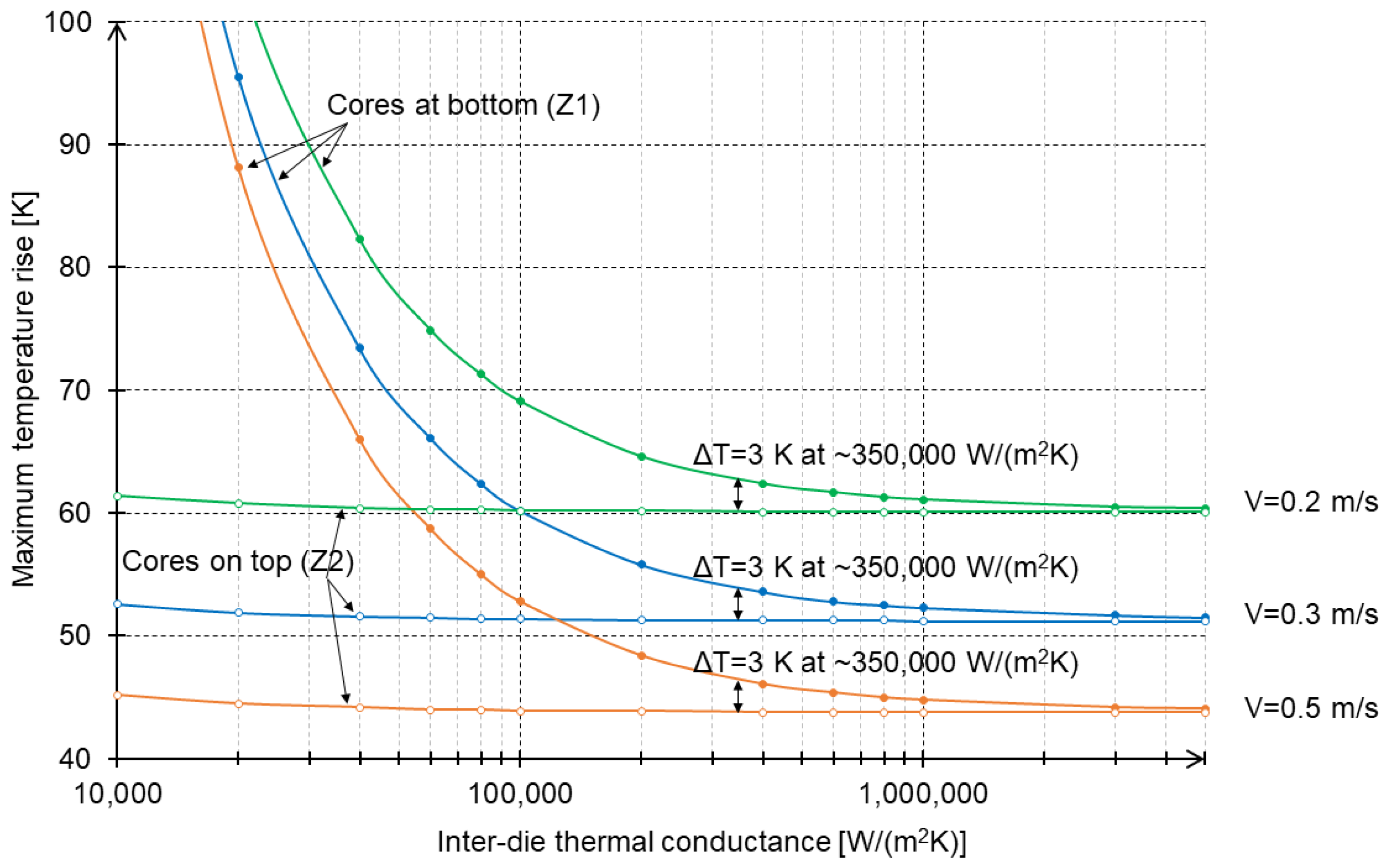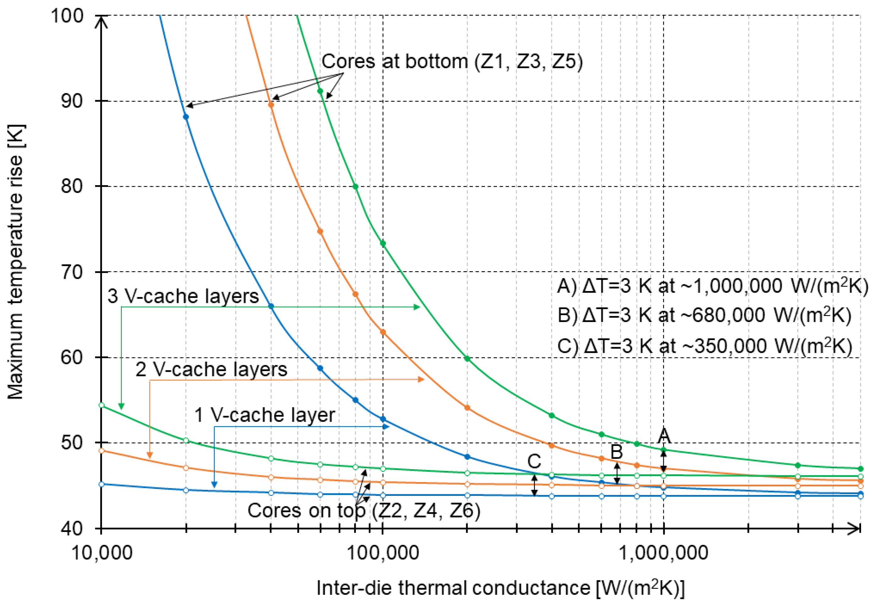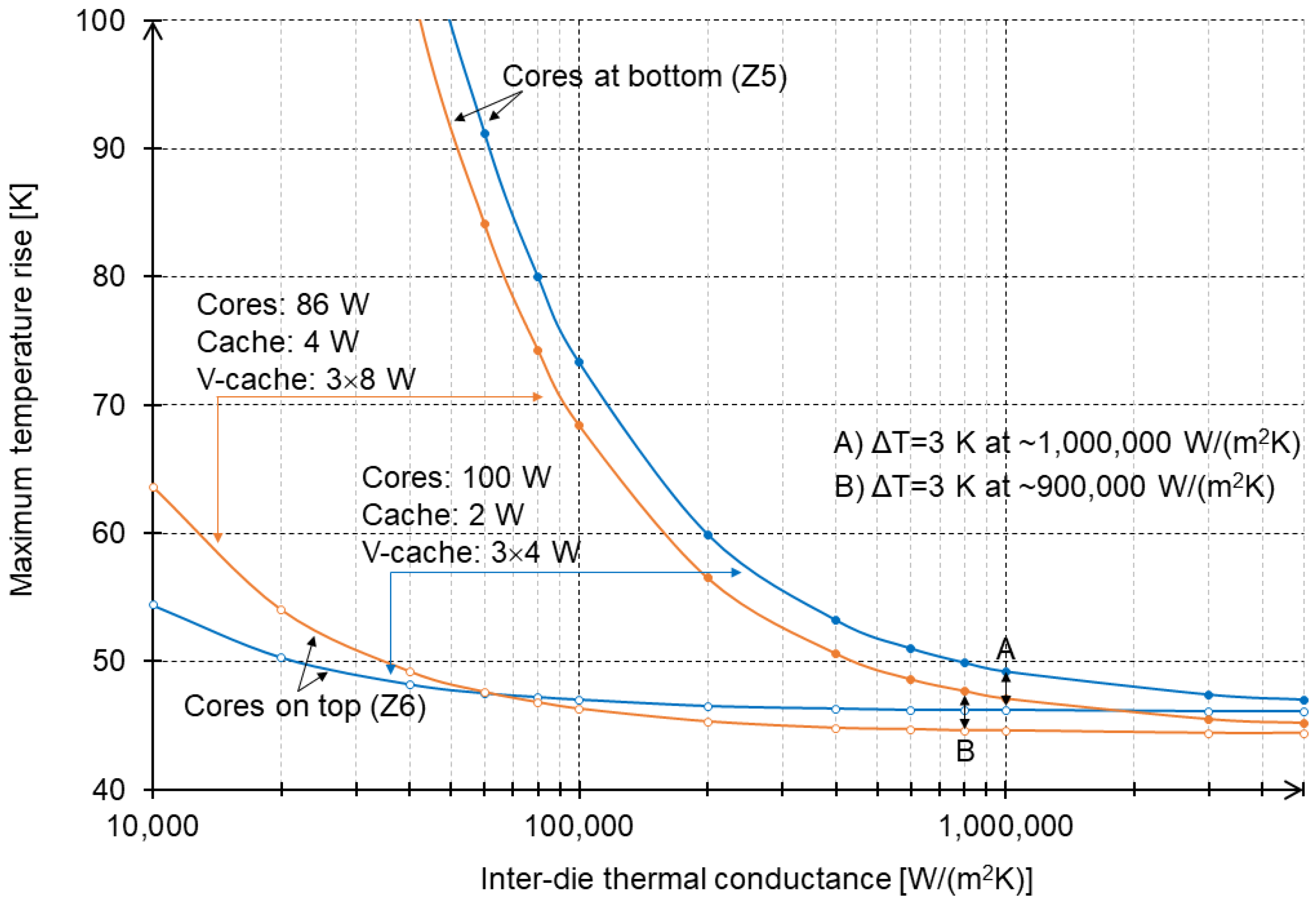 3.4. Analysis 4: The Impact of Inter-Die Thermal Conductance on Temperatures for Different Vertical Arrangements of Core and V-Cache Dies