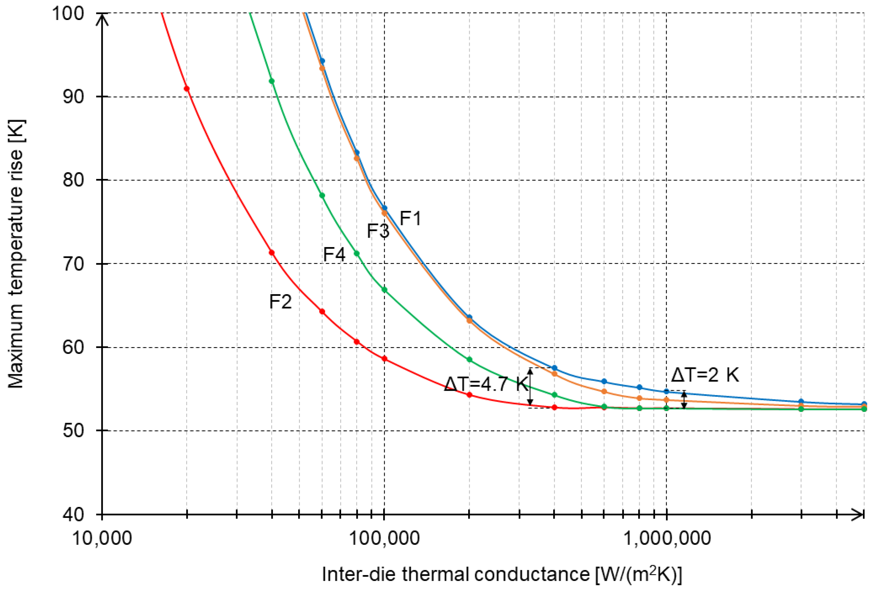 3.5. Analysis 5: The Impact of Inter-Die Thermal Conductance on the Intensity of Local Temperature Hot Spots