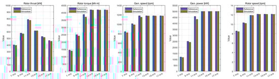 To validate the constructed model, the analysis results of the developed OpenFAST model were compared with those presented by Jonkman et al. [], as shown in Figure 4. For the 5 MW turbine, which has a rated wind speed of 11.4 m/s, the rotor thrust reaches its maximum near 11 m/s, after which the rotor speed and torque remain nearly constant. Although minor discrepancies appear between the analysis results at each wind speed and those reported by Jonkman et al. [], the overall trends exhibited good agreement.