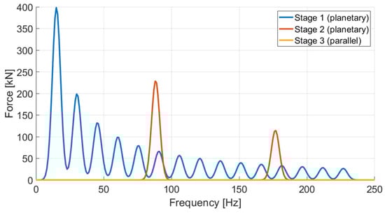 In actual wind turbines, nacelle excitation forces arise not only from direct loading due to wind and waves but also from drivetrain rotation. To account for these effects, the GMF of the drivetrain was calculated and incorporated into our analysis. For a precise calculation, modeling of 5 MW drivetrain used in the NREL 5 MW reference turbine is required; however, such modeling is beyond the scope of this study. Therefore, direct modeling was not performed. Instead, the GMF was estimated by applying the methodology proposed by Marmo et al. [] based on detailed gearbox information provided by Nejad et al. [] for a 5 MW gearbox. Marmo et al. [] modeled the drivetrain excitation forces up to the 15th harmonic, assuming a normal distribution, and scaled them according to the wind speed. In contrast, we calculated the GMF based on OpenFAST simulation results corresponding to different wind speeds. The specifications of the gearbox presented by Nejad et al. [] are shown in Table 7.