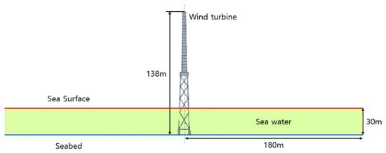 To analyze the underwater radiated noise of the turbine, the seawater domain must be modeled. If the acoustic domain is too small, then low-frequency soundwaves cannot be predicted accurately, leading to errors. Therefore, the distance from the noise source to the boundary of the analysis domain was configured to be at least one wavelength at the lowest frequency. The minimum frequency was set to 10 Hz and the analysis domain was defined as extending 180 m from the tower center, which exceeds the wavelength of a 10 Hz underwater soundwave (approximately 150 m).