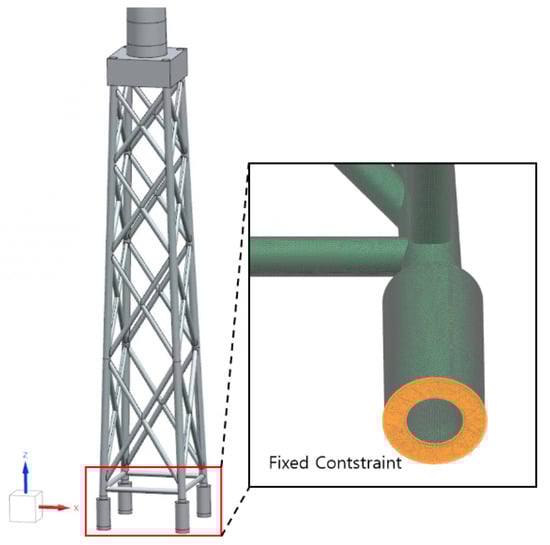 The support base of the wind turbine was firmly connected to the ground, ensuring that the vibrations caused by the rotor rotation and waves propagated through the substructure without separation. Therefore, all six degrees of freedom at the bottom four grout surfaces of the jacket were fixed by applying fixed boundary conditions, as shown in Figure 9.